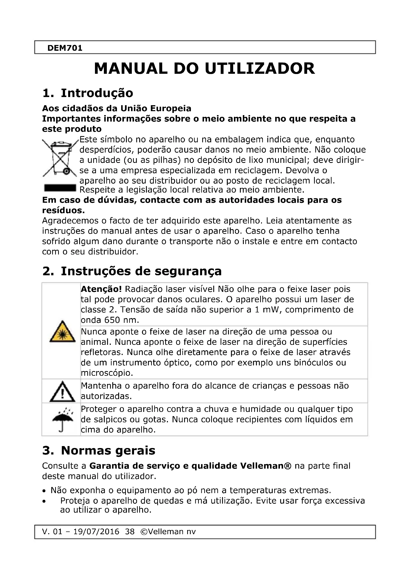 Consulte a Garantia de serviço e qualidade Velleman® na parte final deste manual do utilizador. Não exponha o equipamento ao pó nem a temperaturas extremas. Proteja o aparelho de quedas e má utilização. Evite usar força excessiva ao utilizar o aparelho.DEM701