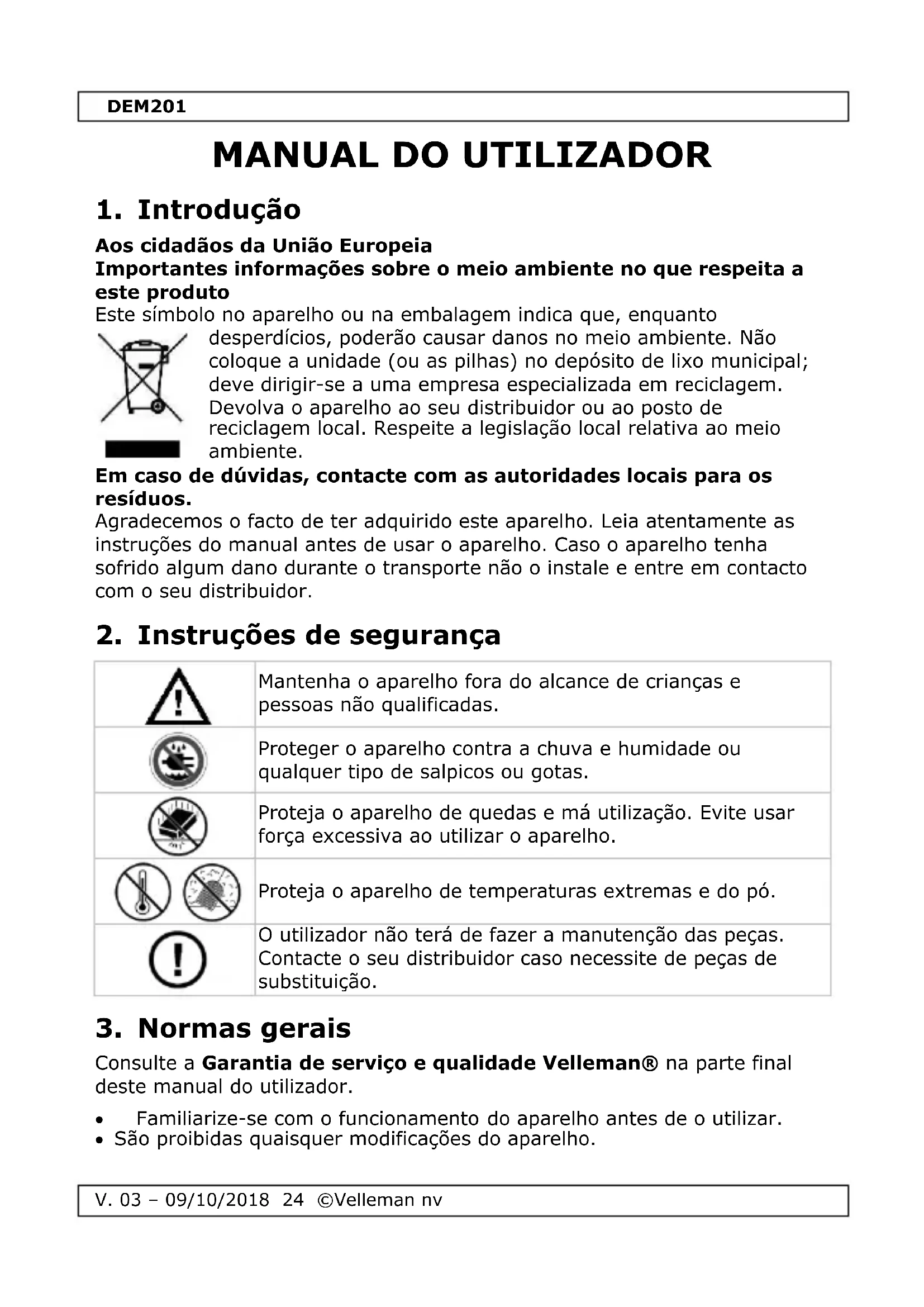 Consulte a Garantia de serviço e qualidade Velleman® na parte final deste manual do utilizador. Familiarize-se com o funcionamento do aparelho antes de o utilizar. São proibidas quaisquer modificações do aparelho.DEM201