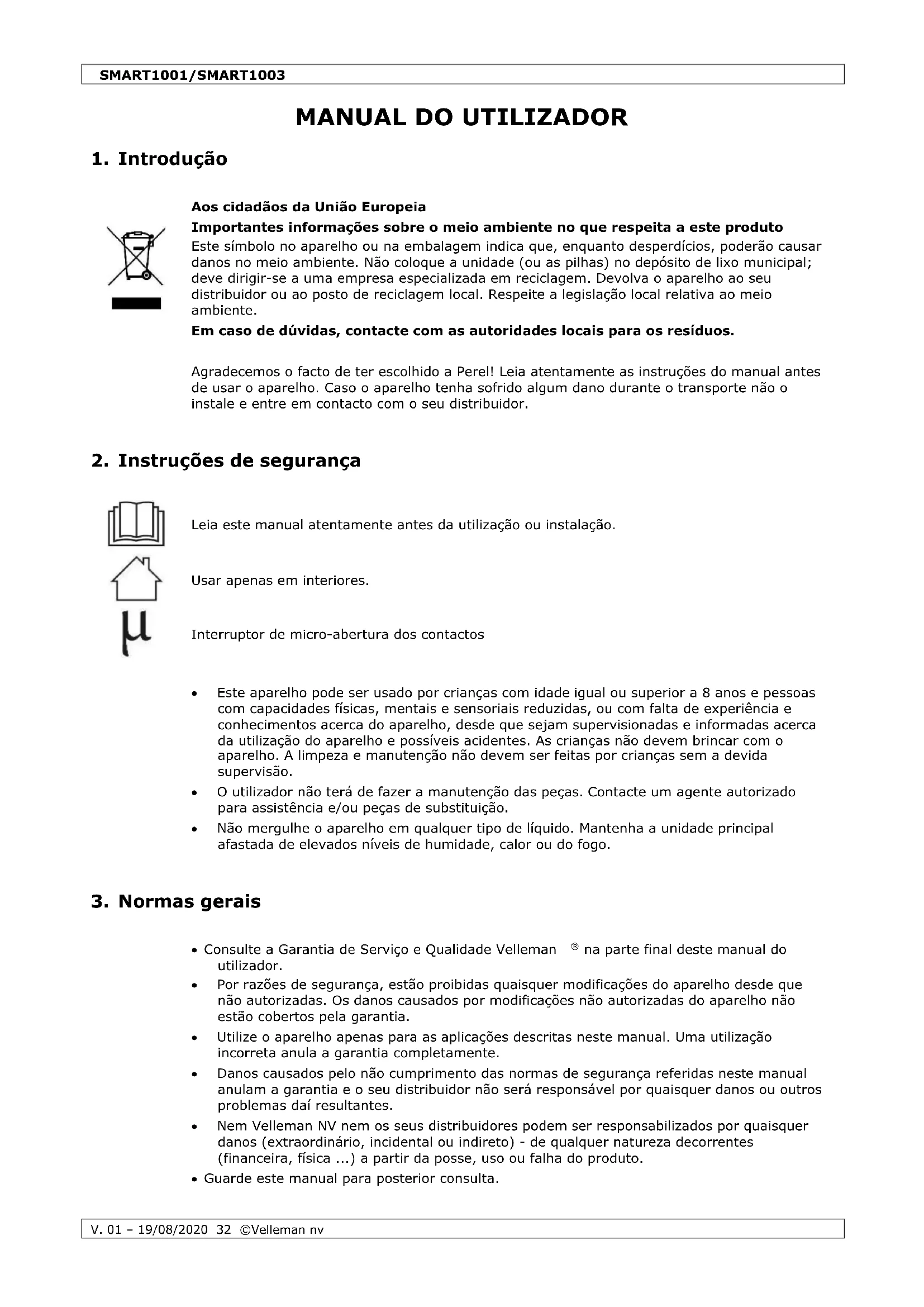 A Velleman NV declara que o equipamento de rádio do tipo SMART1001/SMART1003 está em conformidade com a Diretiva 2014/53/EU. O texto completo da declaração UE de conformidade está disponível no seguinte endereço: www.velleman.eu.