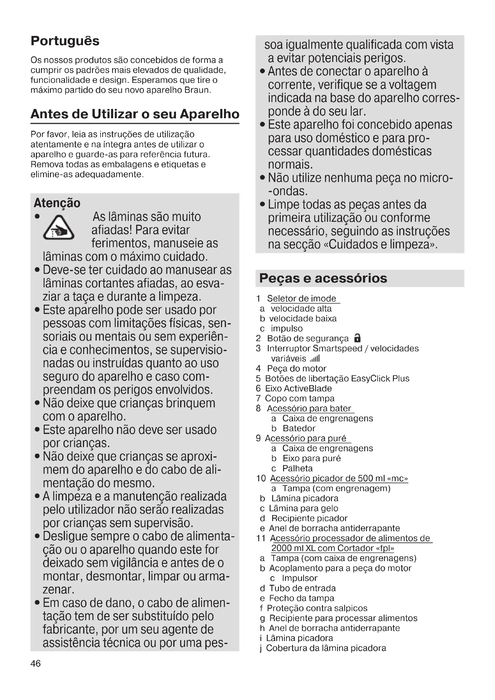 Limpe todas as peças antes da primeira utilização ou conforme necessário, seguindo as instruções na secção «Cuidados e limpeza». Peças e acessórios 1 Seletor de imode a velocidade alta b velocidade baixa c impulso 2 Botão de segurança 3 Interruptor Smartspeed / velocidades variáveis 4 Peça do motor 5 Botões de libertação EasyClick Plus 6 Eixo ActiveBlade 7 Copo com tampa 8 Acessório para bater a Caixa de engrenagens b Batedor 9 Acessório para puré a Caixa de engrenagens b Eixo para puré c Palheta 10 Acessório picador de 500 ml «mc» a Tampa (com engrenagem) b Lâmina picadora c Lâmina para gelo d Recipiente picador e Anel de borracha antiderrapante 11 Acessório processador de alimentos de 2000 ml XL com Cortador «fpl» a Tampa (com caixa de engrenagens) b Acoplamento para a peça do motor c Impulsor d Tubo de entrada e Fecho da tampa f Proteção contra salpicos g Recipiente para processar alimentos h Anel de borracha antiderrapante i Lâmina picadora j Cobertura da lâmina picadora 5722112384_HB901-MQ91-75-87-95 INT.indd 46 01.07.20 13:4747 k Utensílio para massa (FP) l Gancho de amassar (Cortador) m Lâmina do cortador n Base do cortador o Impulsor para limpeza p Suporte de encaixe (i) Encaixe para fatiar (fino, grosso) (ii) Encaixes para triturar (fino, grosso) (iii) Encaixe para cortar em juliana q Disco para cortar em palitos r Eixo do disco 12 Suporte para armazenamento Como utilizar o aparelho Interruptor Smartspeed para velocidades variáveis Um acionamento, todas as velocidades. Quanto mais pressionar, maior será a velocidade. Quanto maior for a velocidade, mais rápidos e finos serão os resultados de mistura e picagem. Operação com uma só mão: o interruptor Smartspeed (3) permite-lhe ligar o aparelho e controlar a velocidade com uma mão. Operar a varinha mágica Primeira utilização: Remova o bloqueio de transporte da peça do motor (4), puxando a fita vermelha.. Ligar (A) O aparelho vem com um seletor de imode (1) e um botão de segurança (2) para libertar o interruptor Smartspeed (3). Siga as instruções para iniciar o aparelho: