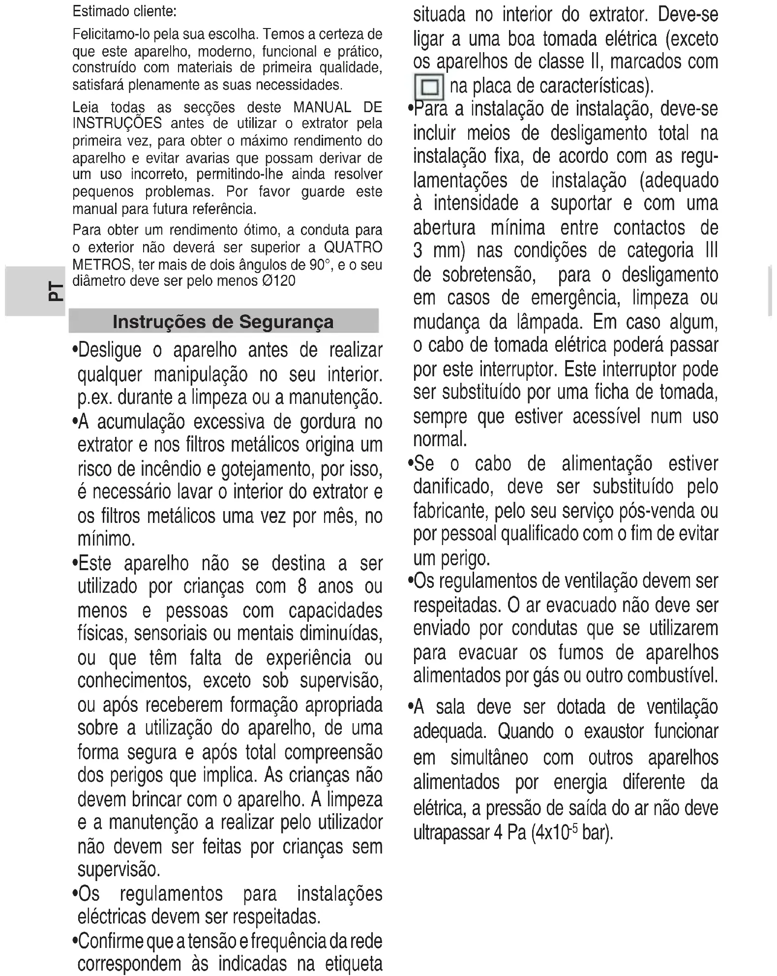 Estimado cliente: Felicitamo-lo pela sua escolha. Temos a certeza de que este aparelho, moderno, funcional e prático, construído com materiais de primeira qualidade, satisfará plenamente as suas necessidades. Leia todas as secções deste MANUAL DE INSTRUÇÕES antes de utilizar o extrator pela primeira vez, para obter o máximo rendimento do aparelho e evitar avarias que possam derivar de um uso incorreto, permitindo-lhe ainda resolver pequenos problemas. Por favor guarde este manual para futura referência. Para obter um rendimento ótimo, a conduta para o exterior não deverá ser superior a QUATRO METROS, ter mais de dois ângulos de 90°, e o seu diâmetro deve ser pelo menos Ø120