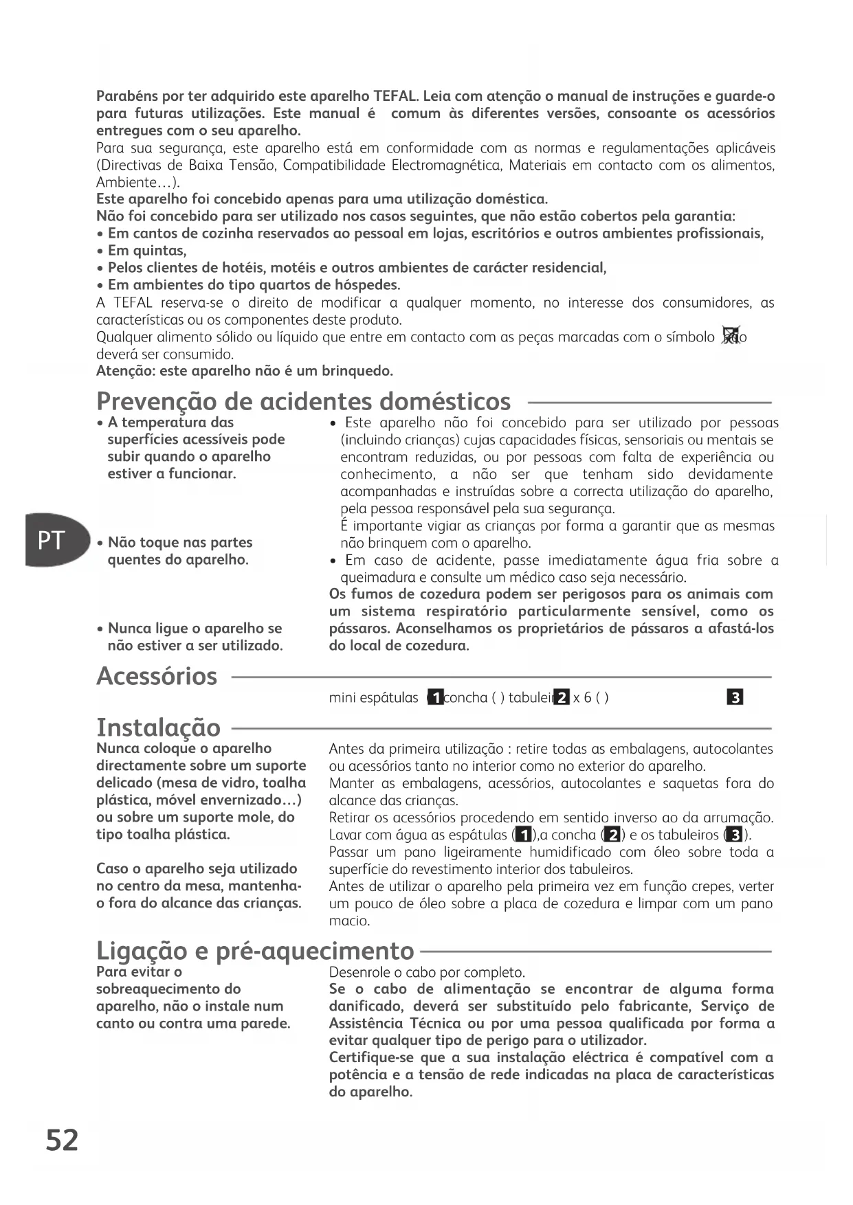 Parabéns por ter adquirido este aparelho TEFAL. Leia com atenção o manual de instruções e guarde-o para futuras utilizações. Este manual é comum às diferentes versões, consoante os acessórios entregues com o seu aparelho. Para sua segurança, este aparelho está em conformidade com as normas e regulamentações aplicáveis (Directivas de Baixa Tensão, Compatibilidade Electromagnética, Materiais em contacto com os alimentos, Ambiente…). Este aparelho foi concebido apenas para uma utilização doméstica. Não foi concebido para ser utilizado nos casos seguintes, que não estão cobertos pela garantia: