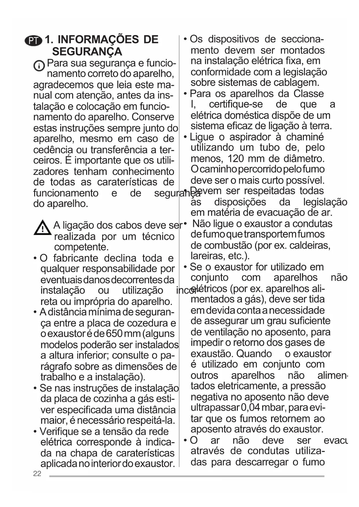 - Emrelaçãoàsmedidastécnicas edesegurançaqueéneces- sário respeitar para evacuar o fumo, é importante seguir atentamente os regulamentos estabelecidos pelas autorida- des locais. ADVERTÊNCIA: antes de instalar o exaustor, retire as películasdeproteção.