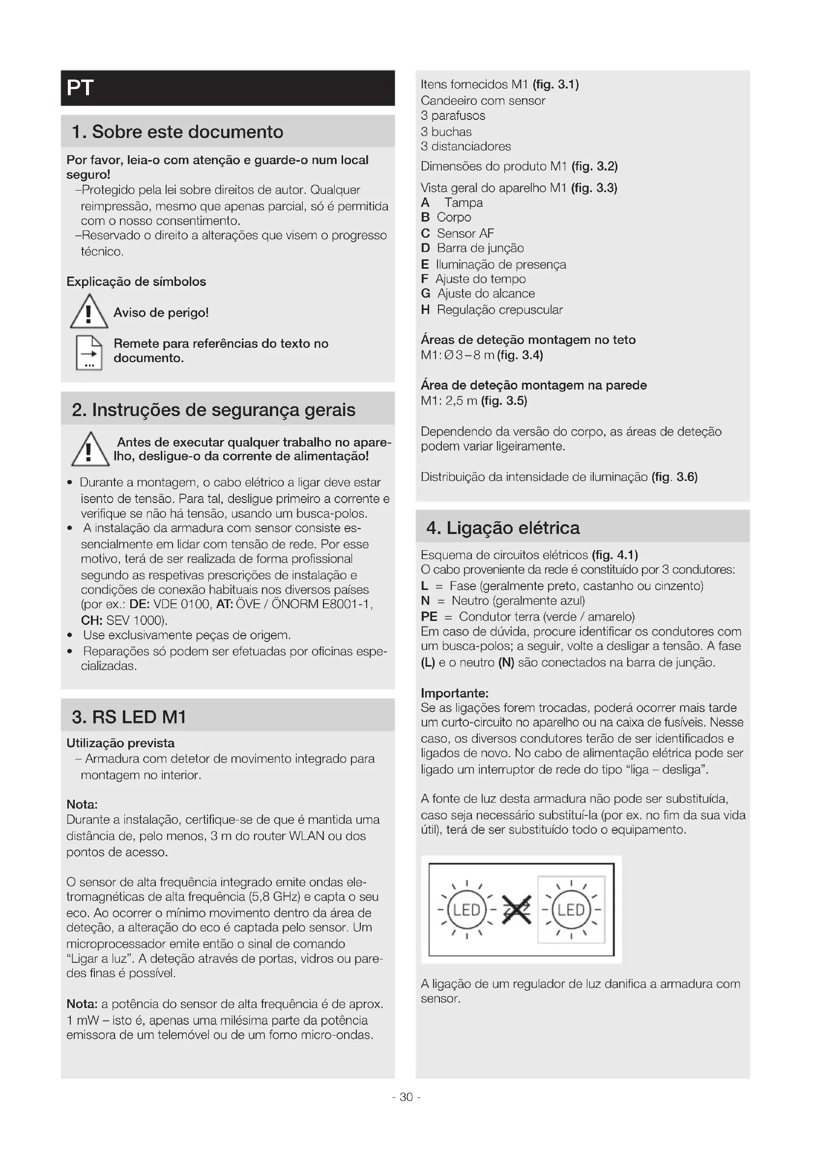 Luz de cortesía 10% Índice de protección IP 20 Clase de aislamiento II Temperatura ambiente -10 a +40°C Clase de eficiencia energética: Este producto incluye una fuente de luz de la clase de eficiencia energética “F”. ES- 30 - Itens fornecidos M1 (fig. 3.1) Candeeiro com sensor 3 parafusos 3 buchas 3 distanciadores Dimensões do produto M1 (fig. 3.2) Vista geral do aparelho M1 (fig. 3.3) A Tampa B Corpo C Sensor AF D Barra de junção E Iluminação de presença F Ajuste do tempo G Ajuste do alcance H Regulação crepuscular Áreas de deteção montagem no teto M1: Ø 3 – 8m (fig.3.4) Área de deteção montagem na parede M1: 2,5m (fig.3.5) Dependendo da versão do corpo, as áreas de deteção podem variar ligeiramente. Distribuição da intensidade de iluminação (fig.3.6)