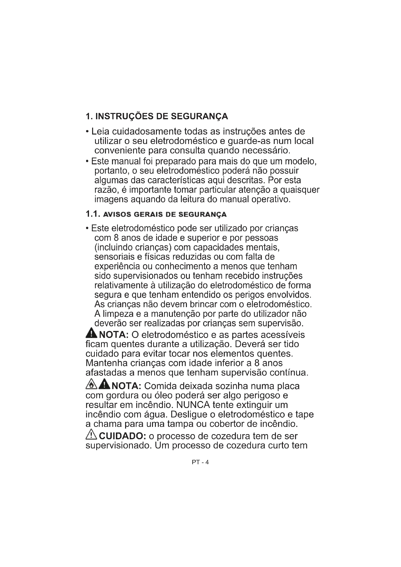 - Este eletrodoméstico pode ser utilizado por crianças com 8 anos de idade e superior e por pessoas (incluindo crianças) com capacidades mentais, sensoriais e físicas reduzidas ou com falta de experiência ou conhecimento a menos que tenham sido supervisionados ou tenham recebido instruções relativamente à utilização do eletrodoméstico de forma segura e que tenham entendido os perigos envolvidos. As crianças não devem brincar com o eletrodoméstico. A limpeza e a manutenção por parte do utilizador não deverão ser realizadas por crianças sem supervisão. NOTA: O eletrodoméstico e as partes acessíveis ficam quentes durante a utilização. Deverá ser tido cuidado para evitar tocar nos elementos quentes. Mantenha crianças com idade inferior a 8 anos afastadas a menos que tenham supervisão contínua. NOTA: Comida deixada sozinha numa placa com gordura ou óleo poderá ser algo perigoso e resultar em incêndio. NUNCA tente extinguir um incêndio com água. Desligue o eletrodoméstico e tape a chama para uma tampa ou cobertor de incêndio. CUIDADO: o processo de cozedura tem de ser supervisionado. Um processo de cozedura curto temPT - 5 de ser sempre supervisionado. NOTA: Perigo de incêndio: Não coloque itens sobre as superfícies de cozedura. NOTA: Se a superfície estiver rachada, desligue o eletrodoméstico para evitar a possibilidade de choque elétrico.