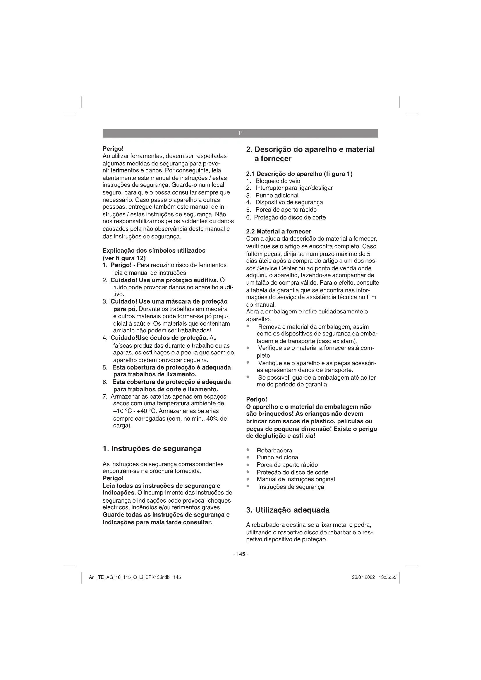 A rebarbadora destina-se a lixar metal e pedra, utilizando o respetivo disco de rebarbar e o res- petivo dispositivo de proteção. Anl_TE_AG_18_115_Q_Li_SPK13.indb 145Anl_TE_AG_18_115_Q_Li_SPK13.indb 145 26.07.2022 13:55:5526.07.2022 13:55:55P