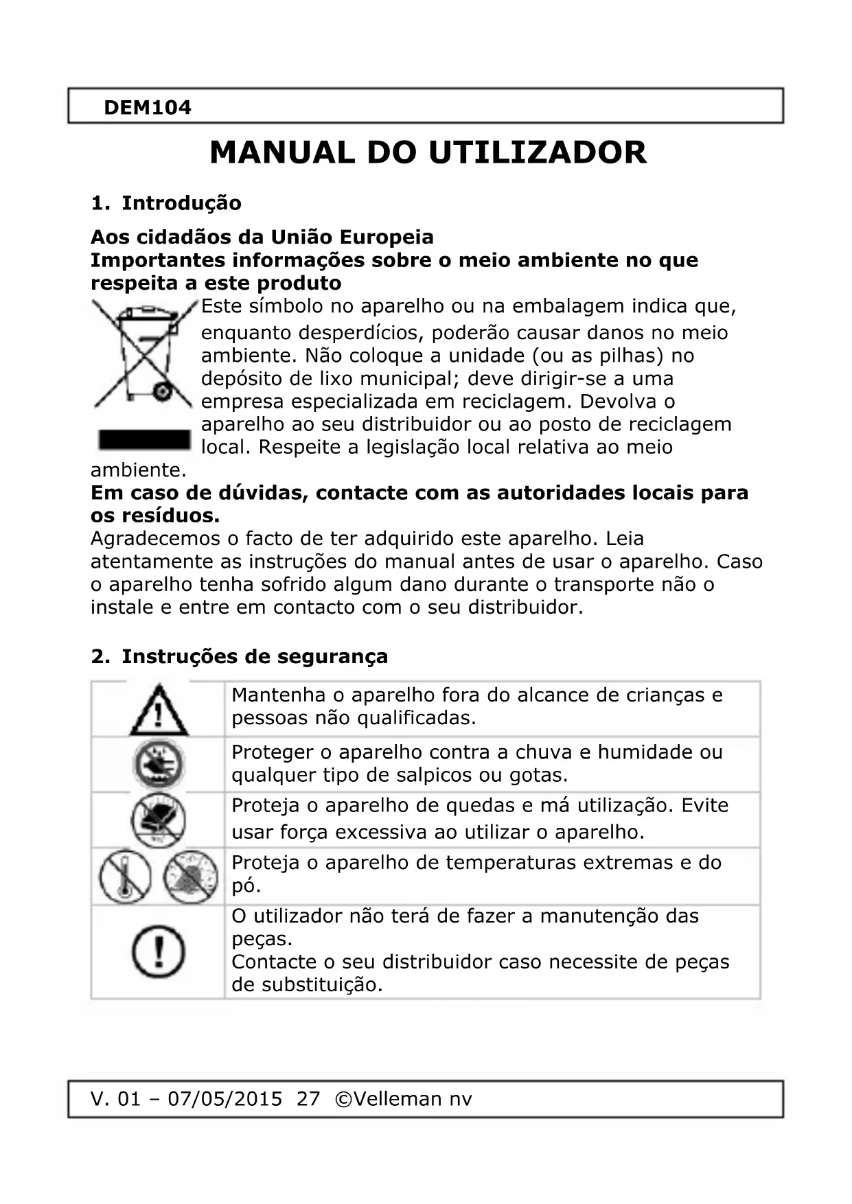 Encontre gratuitamente o manual do aparelho DEM104 VELLEMAN em formato PDF.