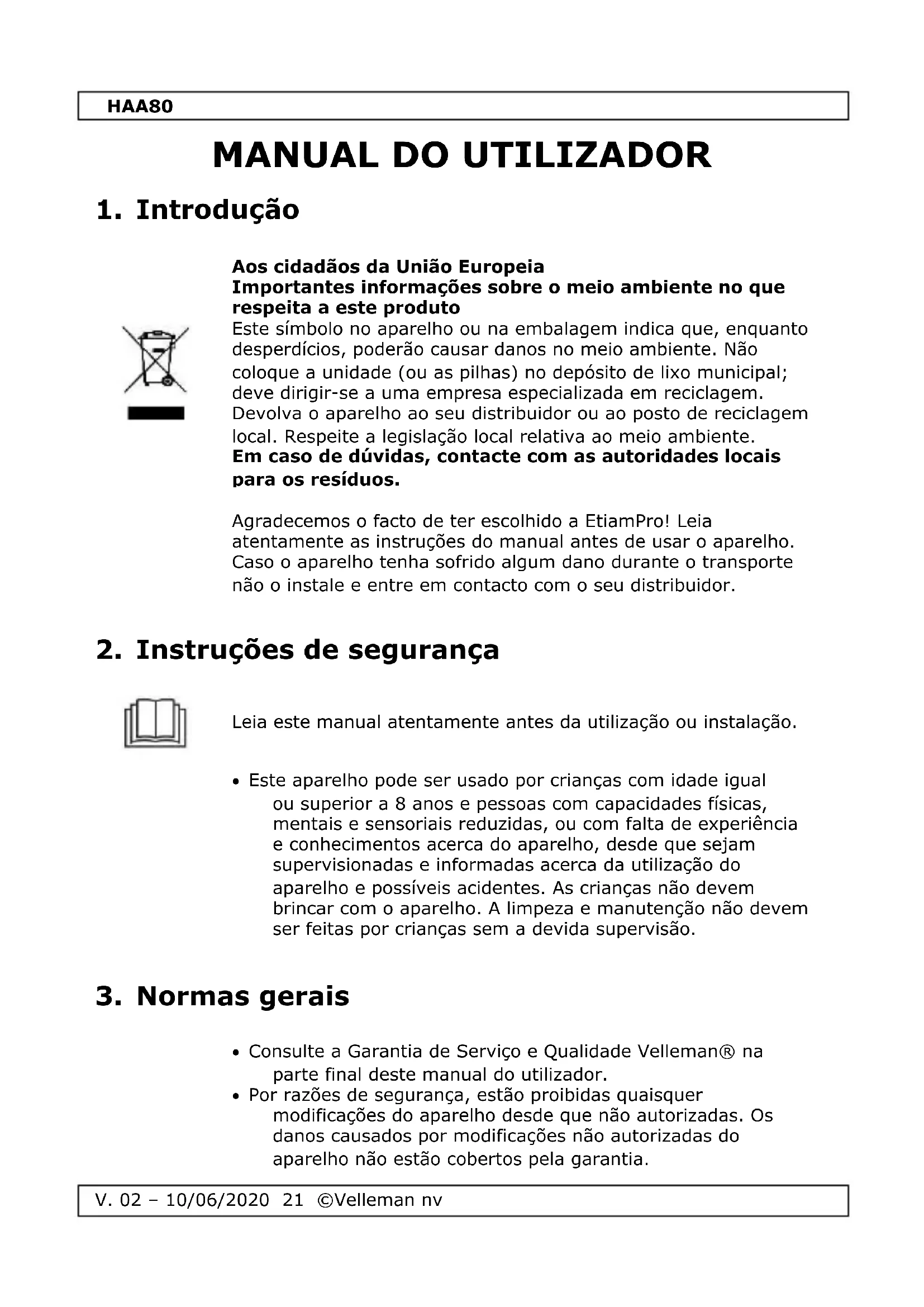 Utilize este aparelho apenas com acessórios originais. A Velleman NV não será responsável por quaisquer danos ou lesões causados pelo uso (indevido) do aparelho. Para mais informação sobre este produto e para aceder à versão mais recente deste manual do utilizador, visite a nossa página www.velleman.eu. Podem alterar-se as especificações e o conteúdo deste manual sem aviso prévio.