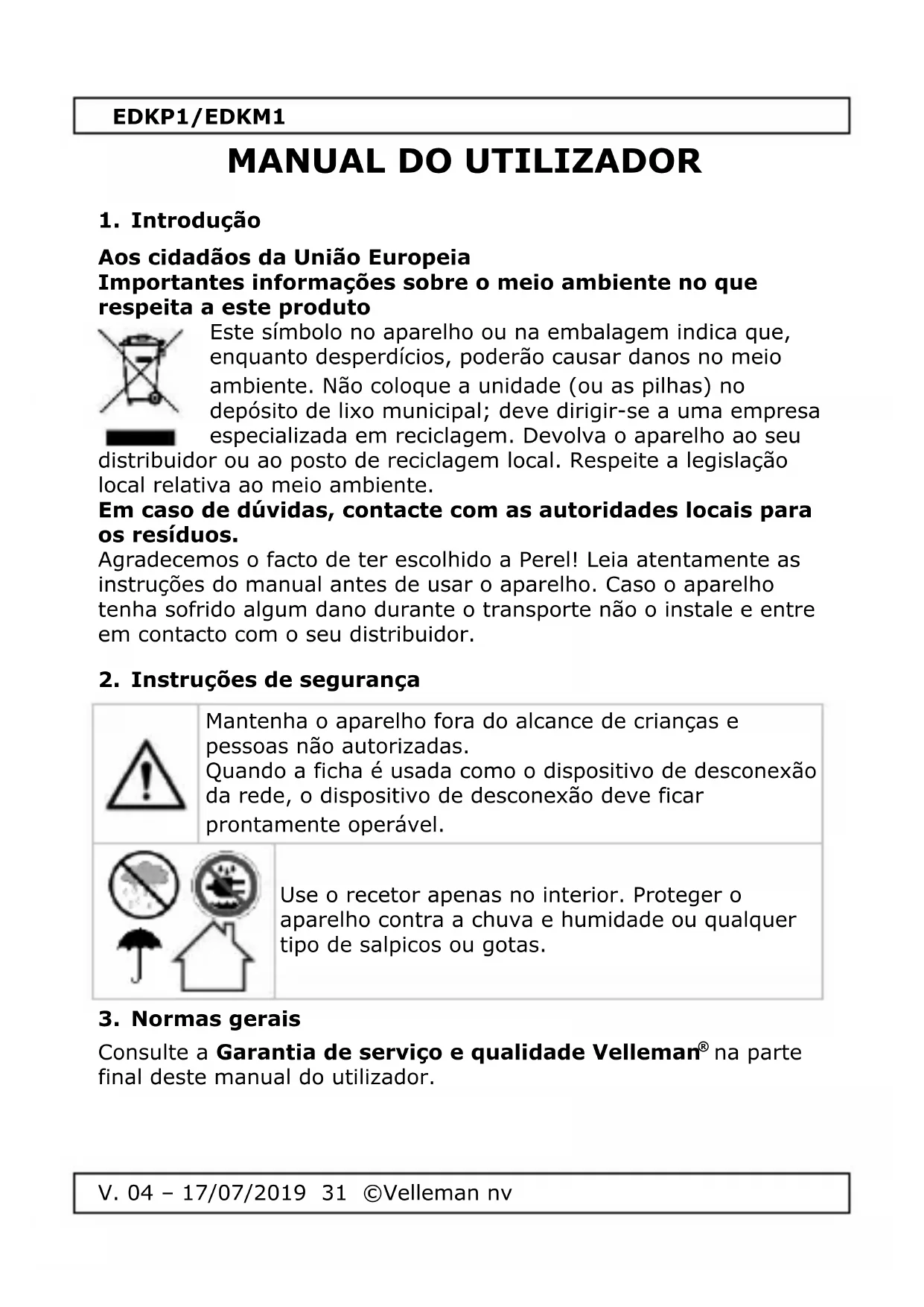 sem fios ............................................................... sim alcance ................................... 150 m em espaço amplo auto-aprendizagem ................................................ sim campainha ...................................................... cinética número de sons ...................................................... 32 classificação IP (transmissor) ................................ IP44 recetor de fonte de alimentação EDKP1 ....................................... ficha Euro standard EDKM1 ................................. 3 x 1.5 V AA (não incl.) Utilize este aparelho apenas com acessórios originais. A Velleman NV não será responsável por quaisquer danos ou lesões causados pelo uso (indevido) do aparelho. Para mais informação sobre este produto e para aceder à versão mais recente deste manual do utilizador, visite a nossa página www.perel.eu. Podem alterar-se as especificações e o conteúdo deste manual sem aviso prévio.EDKP1/EDKM1