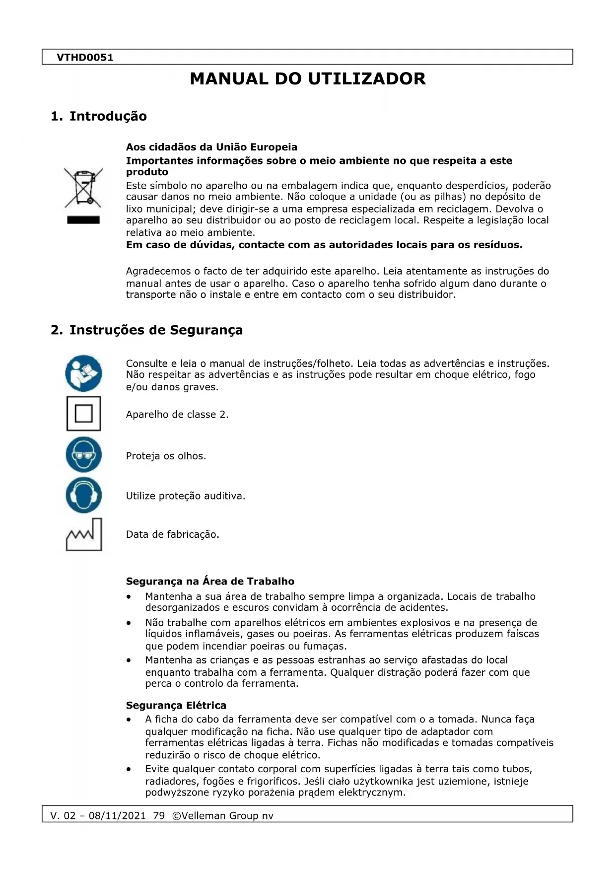 Baixe as instruções para o seu Furadeira em formato PDF gratuitamente! Encontre o seu manual VTHD0051 - VELLEMAN e retome o controlo do seu dispositivo eletrónico. Nesta página estão publicados todos os documentos necessários para a utilização do seu dispositivo. VTHD0051 da marca VELLEMAN.