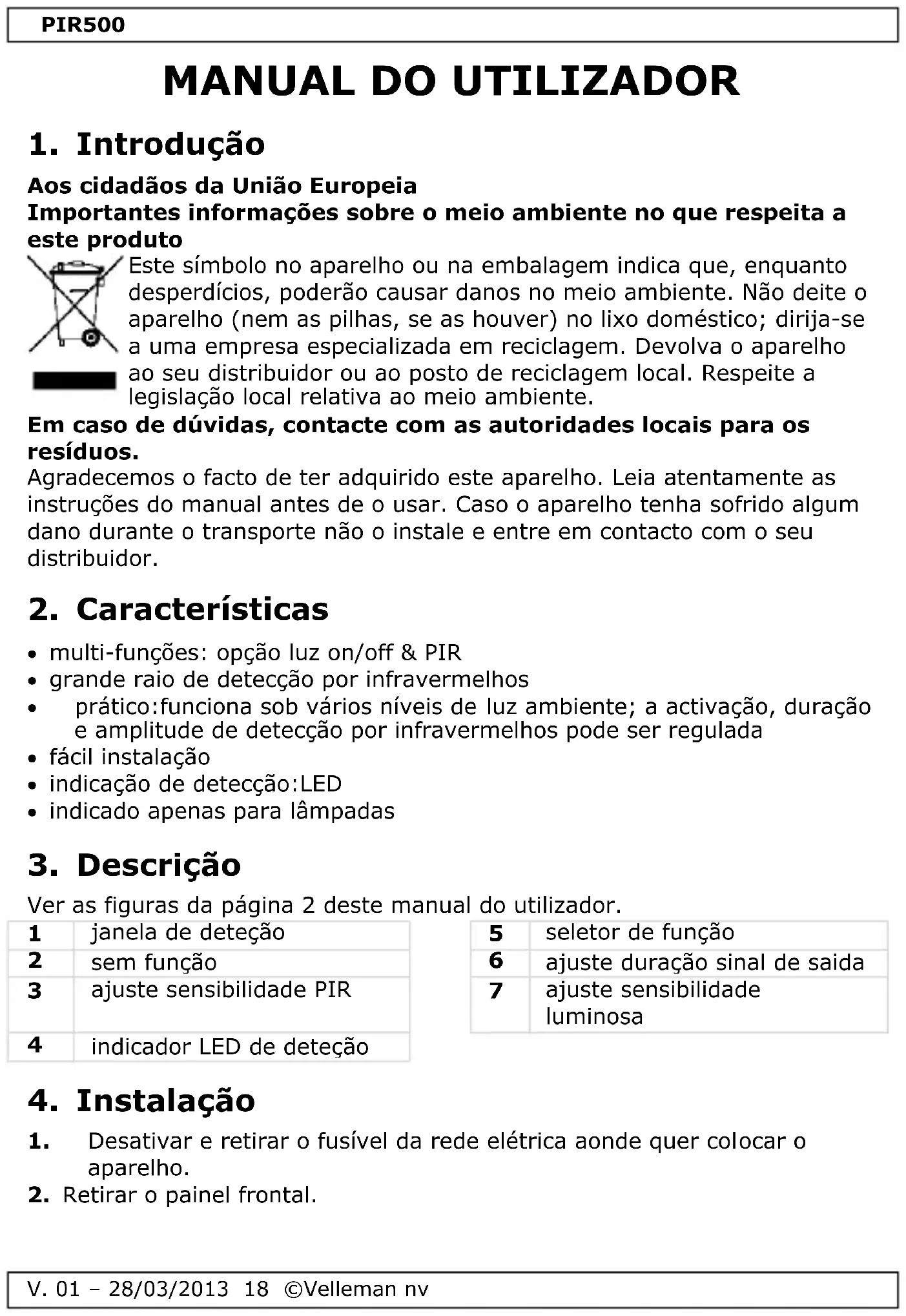 Encontre gratuitamente o manual do aparelho PIR500 VELLEMAN em formato PDF.