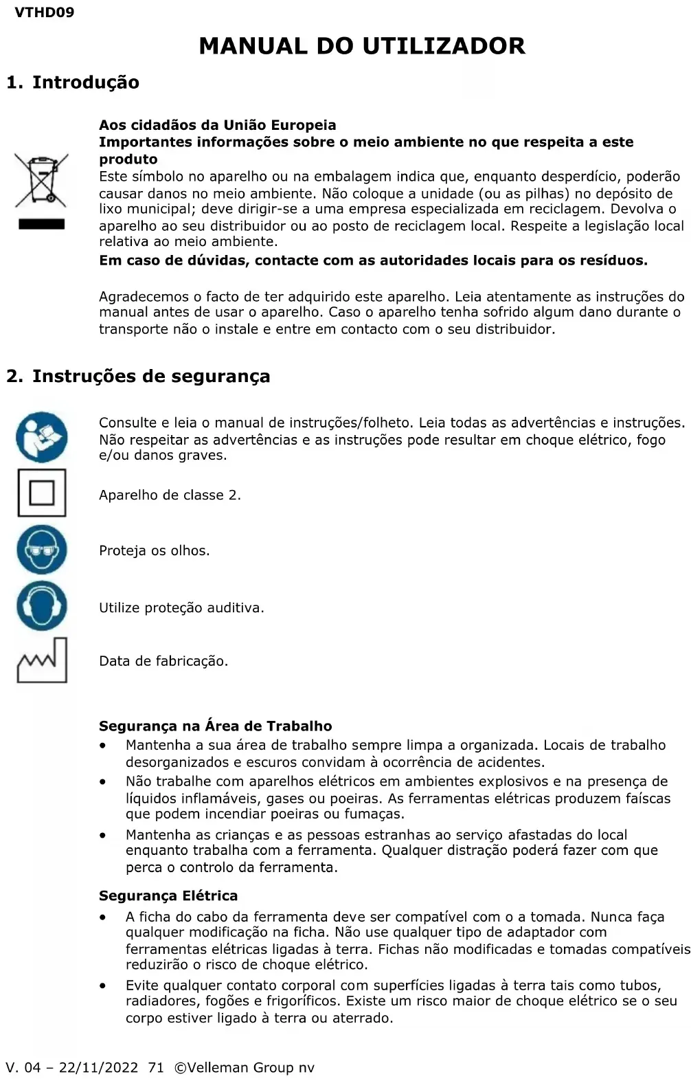 Utilize este aparelho apenas com acessórios originais. A Velleman Group nv não será responsável por quaisquer danos ou lesões causadas pelo uso (indevido) do aparelho. Para mais informação sobre este produto e para aceder à versão mais recente deste manual do utilizador, visite a nossa página www.velleman.eu. Podem alterar-se as especificações e o conteúdo deste manual sem aviso prévio.