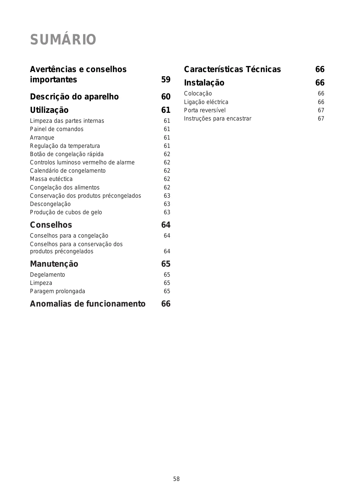 Limpeza das partes internas Painel de comandos Arranque Regulação da temperatura Botão de congelação rápida Controlos luminoso vermelho de alarme Calendário de congelamento Massa eutéctica Congelação dos alimentos Conservação dos produtos précongelados Descongelação Produção de cubos de gelo Conselhos Conselhos para a congelação Conselhos para a conservação dos produtos précongelados Manutenção Degelamento Limpeza Paragem prolongada Anomalias de funcionamento Características Técnicas