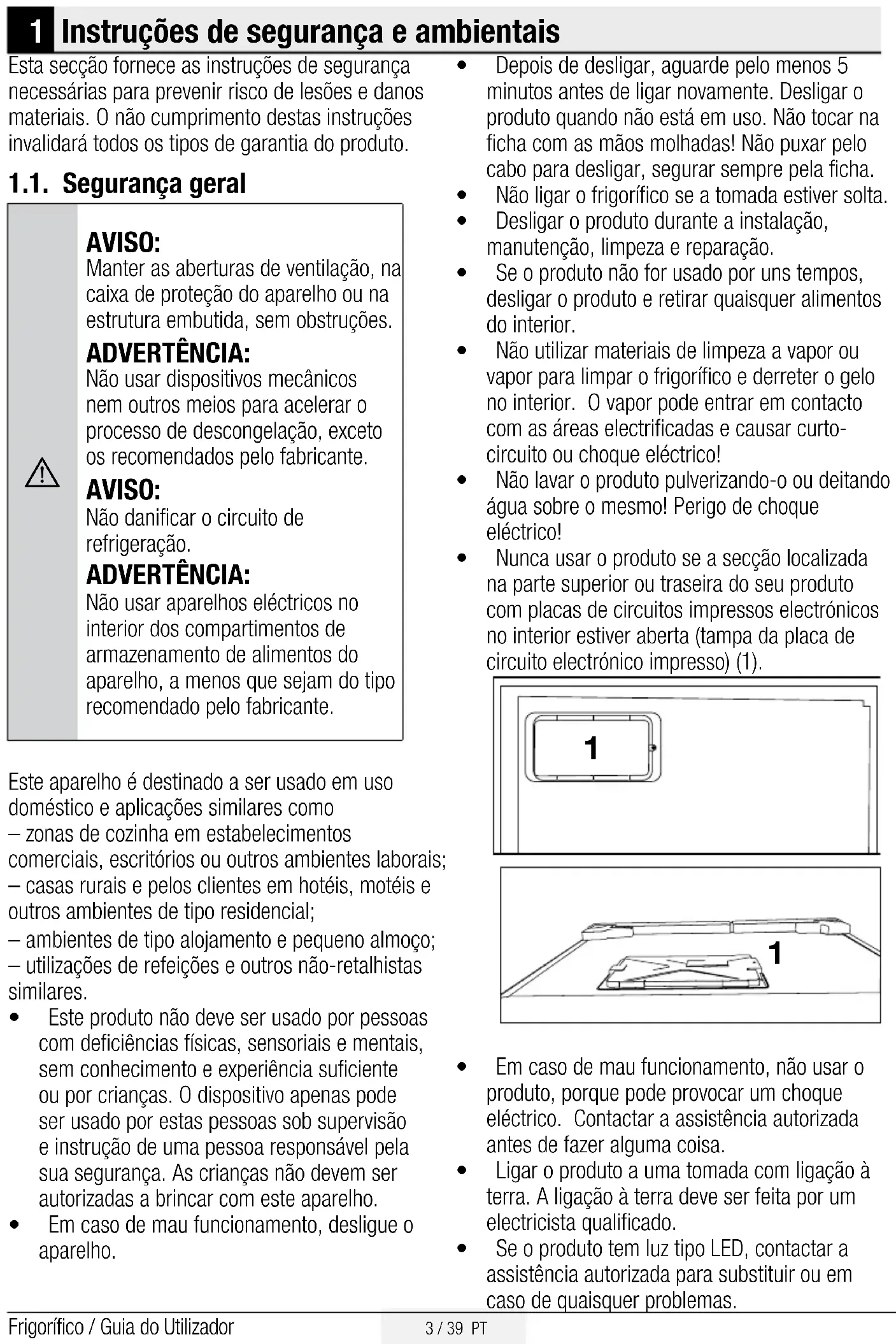 AVISO: Manter as aberturas de ventilação, na caixa de proteção do aparelho ou na estrutura embutida, sem obstruções. ADVERTÊNCIA: Não usar dispositivos mecânicos nem outros meios para acelerar o processo de descongelação, exceto os recomendados pelo fabricante. AVISO: Não danificar o circuito de refrigeração. ADVERTÊNCIA: Não usar aparelhos eléctricos no interior dos compartimentos de armazenamento de alimentos do aparelho, a menos que sejam do tipo recomendado pelo fabricante. Este aparelho é destinado a ser usado em uso doméstico e aplicações similares como – zonas de cozinha em estabelecimentos comerciais, escritórios ou outros ambientes laborais; – casas rurais e pelos clientes em hotéis, motéis e outros ambientes de tipo residencial; – ambientes de tipo alojamento e pequeno almoço; – utilizações de refeições e outros não-retalhistas similares. t Este produto não deve ser usado por pessoas com deficiências físicas, sensoriais e mentais, sem conhecimento e experiência suficiente ou por crianças. O dispositivo apenas pode ser usado por estas pessoas sob supervisão e instrução de uma pessoa responsável pela sua segurança. As crianças não devem ser autorizadas a brincar com este aparelho. t Em caso de mau funcionamento, desligue o aparelho. t Depois de desligar, aguarde pelo menos 5 minutos antes de ligar novamente. Desligar o produto quando não está em uso. Não tocar na ficha com as mãos molhadas! Não puxar pelo cabo para desligar, segurar sempre pela ficha. t Não ligar o frigorífico se a tomada estiver solta. t Desligar o produto durante a instalação, manutenção, limpeza e reparação. t Se o produto não for usado por uns tempos, desligar o produto e retirar quaisquer alimentos do interior. t Não utilizar materiais de limpeza a vapor ou vapor para limpar o frigorífico e derreter o gelo no interior. O vapor pode entrar em contacto com as áreas electrificadas e causar curto- circuito ou choque eléctrico! t Não lavar o produto pulverizando-o ou deitando água sobre o mesmo! Perigo de choque eléctrico! t Nunca usar o produto se a secção localizada na parte superior ou traseira do seu produto com placas de circuitos impressos electrónicos no interior estiver aberta (tampa da placa de circuito electrónico impresso) (1).