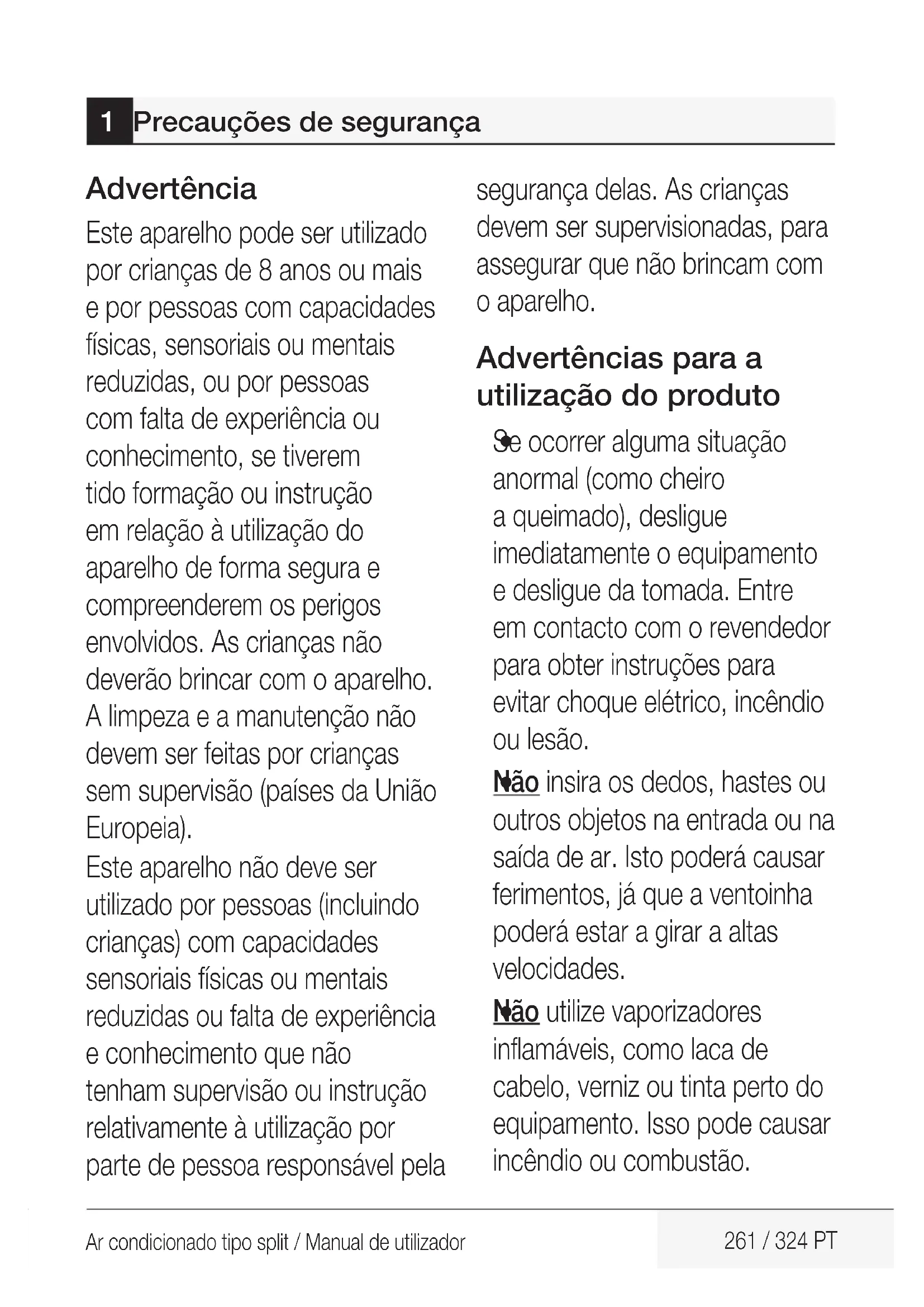 - 14 Diretrizes europeias relativas à eliminação de resíduos 314 15 Instruções de instalação 315 15.1 Instruções para o gás F 16 Especificações 316 260 / 324 PT Ar condicionado tipo split / Manual de utilizadorAr condicionado tipo split / Manual de utilizador 261 / 324 PT Advertência Este aparelho pode ser utilizado por crianças de 8 anos ou mais e por pessoas com capacidades físicas, sensoriais ou mentais reduzidas, ou por pessoas com falta de experiência ou conhecimento, se tiverem tido formação ou instrução em relação à utilização do aparelho de forma segura e compreenderem os perigos envolvidos. As crianças não deverão brincar com o aparelho. A limpeza e a manutenção não devem ser feitas por crianças sem supervisão (países da União Europeia). Este aparelho não deve ser utilizado por pessoas (incluindo crianças) com capacidades sensoriais físicas ou mentais reduzidas ou falta de experiência e conhecimento que não tenham supervisão ou instrução relativamente à utilização por parte de pessoa responsável pela segurança delas. As crianças devem ser supervisionadas, para assegurar que não brincam com o aparelho. Advertências para a utilização do produto p. 315