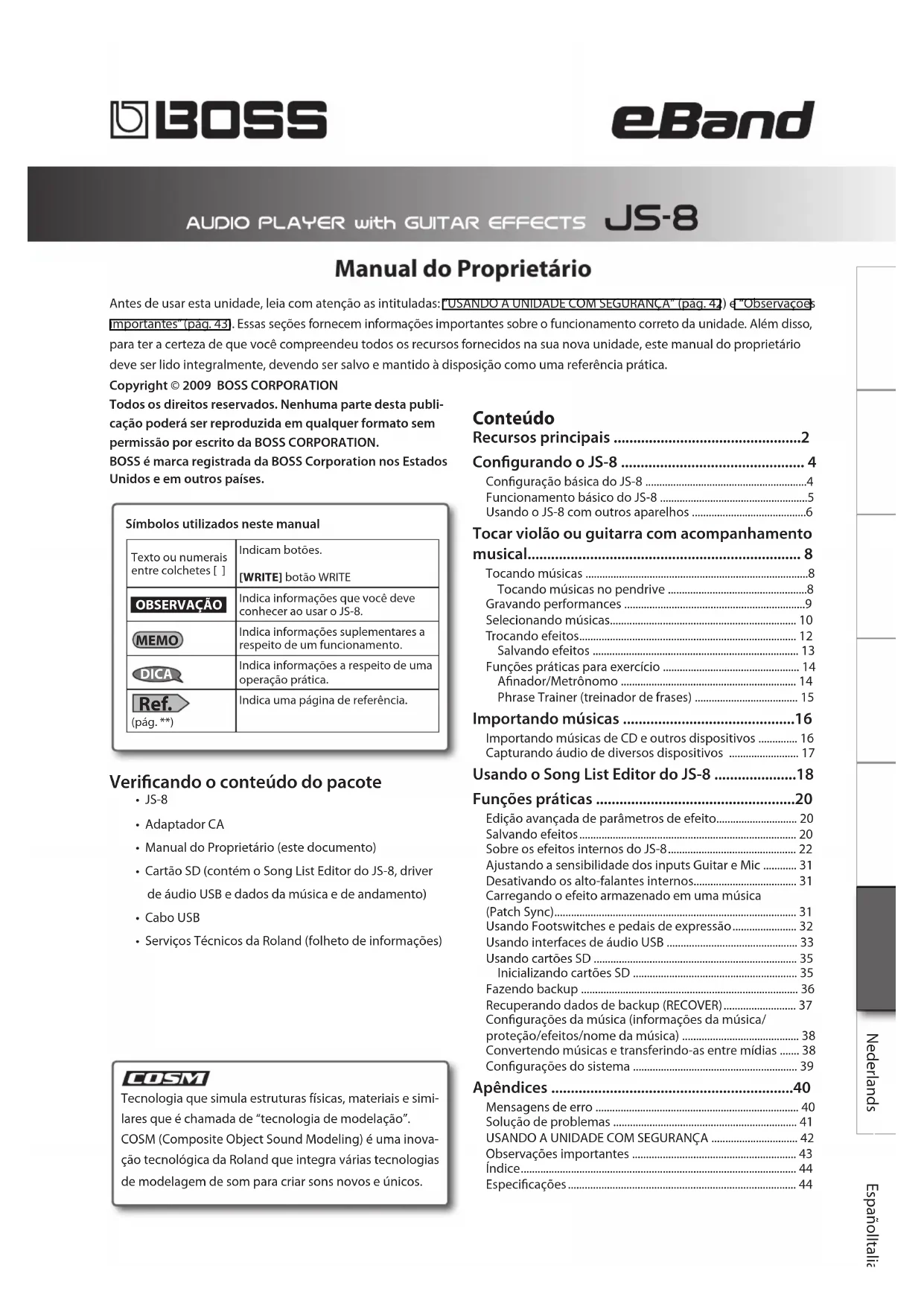 - Pedal de expresión (Roland EV-5, BOSS FV-500L, BOSS FV-500H) 0 dBu = 0,775 Vrms Con el fin de mejorar el producto, las especificaciones y/ o el aspecto de la unidad pueden modificarse sin previo aviso. Método AF (método Adaptive Focus) Es un método patentado de Roland & BOSS que mejora significativamente la relación señal-ruido (S/N) de los convertidores A/D y D/A.NederlandsPortuguêsEspañolItalianoFrançaisDeutschEnglish Manual do Proprietário 201a Antes de usar esta unidade, leia com atenção as intituladas: “USANDO A UNIDADE COM SEGURANÇA” (pág. 42) e “Observações importantes” (pág. 43). Essas seções fornecem informações importantes sobre o funcionamento correto da unidade. Além disso, para ter a certeza de que você compreendeu todos os recursos fornecidos na sua nova unidade, este manual do proprietário deve ser lido integralmente, devendo ser salvo e mantido à disposição como uma referência prática. Copyright © 2009 BOSS CORPORATIONTodos os direitos reservados. Nenhuma parte desta publi-cação poderá ser reproduzida em qualquer formato sem permissão por escrito da BOSS CORPORATION.BOSS é marca registrada da BOSS Corporation nos Estados Unidos e em outros países.Símbolos utilizados neste manualTexto ou numeraisentre colchetes [ ]Indicam botões.[WRITE] botão WRITE OBSERVAÇÃO Indica informações que você deve conhecer ao usar o JS-8. MEMO Indica informações suplementares a respeito de um funcionamento. DICA Indica informações a respeito de uma operação prática. Ref. (pág. **)Indica uma página de referência.Tecnologia que simula estruturas físicas, materiais e simi-lares que é chamada de “tecnologia de modelação”. COSM (Composite Object Sound Modeling) é uma inova-ção tecnológica da Roland que integra várias tecnologias de modelagem de som para criar sons novos e únicos. Vericando o conteúdo do pacote
