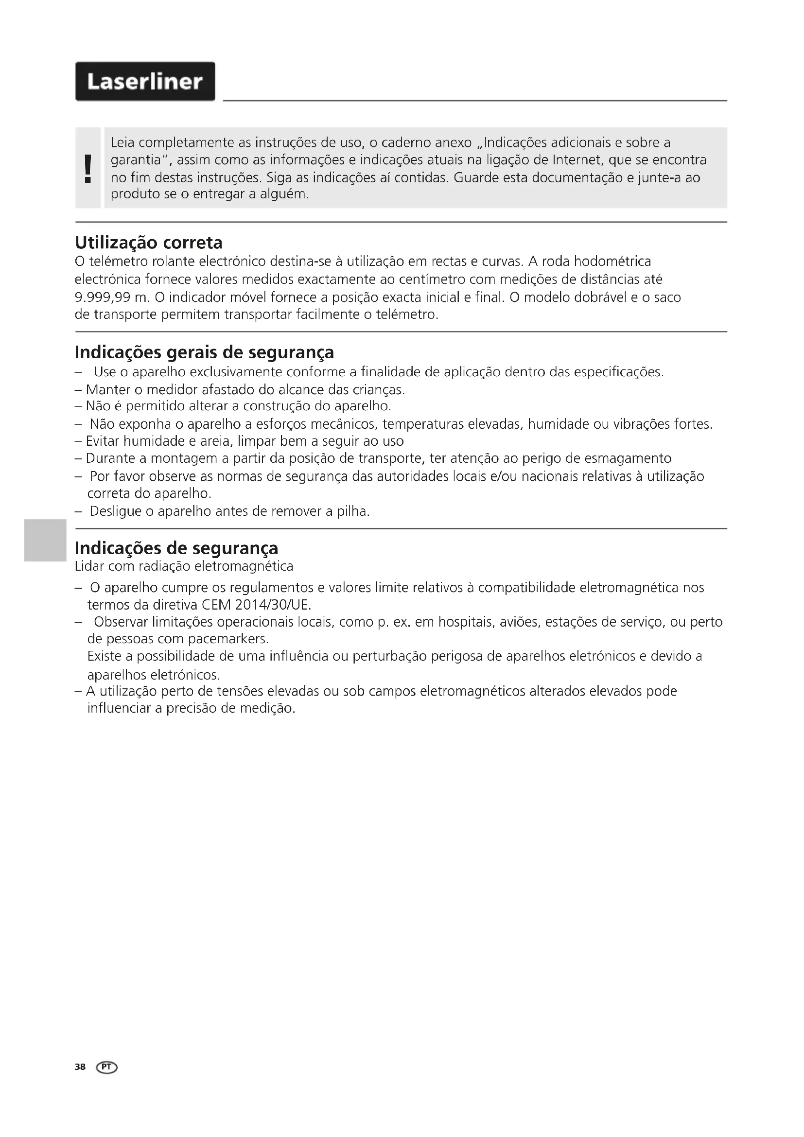 Utilização correta O telémetro rolante electrónico destina-se à utilização em rectas e curvas. A roda hodométrica electrónica fornece valores medidos exactamente ao centímetro com medições de distâncias até 9.999,99 m. O indicador móvel fornece a posição exacta inicial e nal. O modelo dobrável e o saco de transporte permitem transportar facilmente o telémetro. Indicações gerais de segurança – Use o aparelho exclusivamente conforme a nalidade de aplicação dentro das especicações. – Manter o medidor afastado do alcance das crianças. – Não é permitido alterar a construção do aparelho. – Não exponha o aparelho a esforços mecânicos, temperaturas elevadas, humidade ou vibrações fortes. – Evitar humidade e areia, limpar bem a seguir ao uso – Durante a montagem a partir da posição de transporte, ter atenção ao perigo de esmagamento – Por favor observe as normas de segurança das autoridades locais e/ou nacionais relativas à utilização correta do aparelho. – Desligue o aparelho antes de remover a pilha. Indicações de segurança Lidar com radiação eletromagnética – O aparelho cumpre os regulamentos e valores limite relativos à compatibilidade eletromagnética nos termos da diretiva CEM 2014/30/UE. – Observar limitações operacionais locais, como p. ex. em hospitais, aviões, estações de serviço, ou perto de pessoas com pacemarkers. Existe a possibilidade de uma inuência ou perturbação perigosa de aparelhos eletrónicos e devido a aparelhos eletrónicos. – A utilização perto de tensões elevadas ou sob campos eletromagnéticos alterados elevados pode inuenciar a precisão de medição.RollPilot D12
