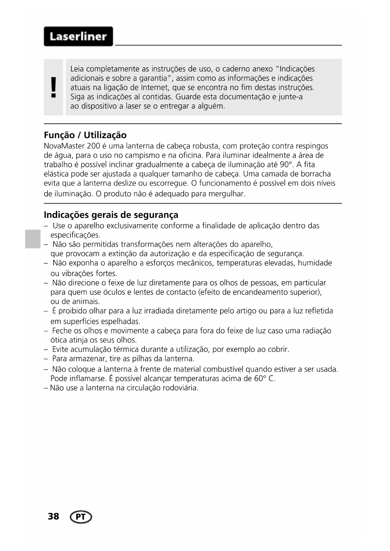 EY-määräykset ja hävittäminen Laite täyttää kaikki EY:n sisällä tapahtuvaa vapaata tavaravaihtoa koskevat standardit. Tämä tuote on sähkölaite. Se on kierrätettävä tai hävitettävä vanhoja sähkö- ja elektroniikkalaitteita koskevan EY-direktiivin mukaan. Lisätietoja, turvallisuus- yms. ohjeita: www.laserliner.com/info Ohjeet huoltoa ja hoitoa varten Puhdista kaikki osat nihkeällä kankaalla. Älä käytä pesu- tai hankausaineita äläkä liuottimia. Ota paristo(t) pois laitteesta pitkän säilytyksen ajaksi. Säilytä laite puhtaassa ja kuivassa paikassa. Tekniset tiedot (Tekniset muutokset mahdollisia. 21W04) Valovirta High / Low 200 / 100 lm Käyttöaika High / Low 6 / 12 h Led-siru Osram SMT3528 Kotelointiluokka IP 54 Virtalähde AAA Ni-MH 1,2 V / AAA alkaliparisto 1,5 V Käyttöympäristö -22° … 65° Varastointiolosuhteet -30° … 65° Kokonaispituus 37 mm Kokonaispaino 100 g FI38 Indicações gerais de segurança – Use o aparelho exclusivamente conforme a finalidade de aplicação dentro das especificações. – Não são permitidas transformações nem alterações do aparelho, que provocam a extinção da autorização e da especificação de segurança. – Não exponha o aparelho a esforços mecânicos, temperaturas elevadas, humidade ou vibrações fortes. – Não direcione o feixe de luz diretamente para os olhos de pessoas, em particular para quem use óculos e lentes de contacto (efeito de encandeamento superior), ou de animais. – É proibido olhar para a luz irradiada diretamente pelo artigo ou para a luz reetida em superfícies espelhadas. – Feche os olhos e movimente a cabeça para fora do feixe de luz caso uma radiação ótica atinja os seus olhos. – Evite acumulação térmica durante a utilização, por exemplo ao cobrir. – Para armazenar, tire as pilhas da lanterna. – Não coloque a lanterna à frente de material combustível quando estiver a ser usada. Pode inamarse. É possível alcançar temperaturas acima de 60° C. – Não use a lanterna na circulação rodoviária. Função / Utilização NovaMaster 200 é uma lanterna de cabeça robusta, com proteção contra respingos de água, para o uso no campismo e na ocina. Para iluminar idealmente a área de trabalho é possível inclinar gradualmente a cabeça de iluminação até 90°. A ta elástica pode ser ajustada a qualquer tamanho de cabeça. Uma camada de borracha evita que a lanterna deslize ou escorregue. O funcionamento é possível em dois níveis de iluminação. O produto não é adequado para mergulhar. Leia completamente as instruções de uso, o caderno anexo “Indicações adicionais e sobre a garantia”, assim como as informações e indicações atuais na ligação de Internet, que se encontra no fim destas instruções. Siga as indicações aí contidas. Guarde esta documentação e junte-a ao dispositivo a laser se o entregar a alguém.