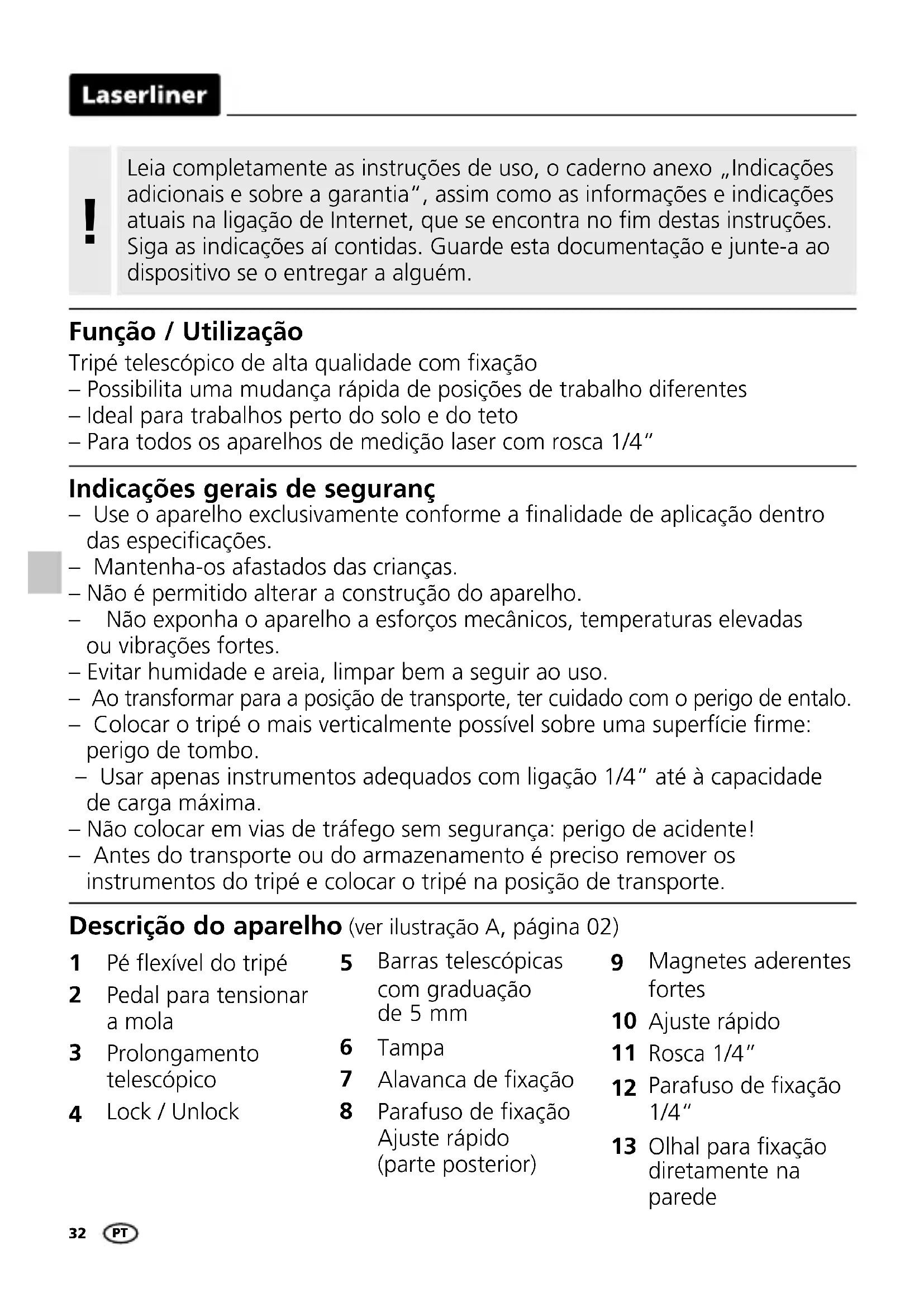 Descrição do aparelho (ver ilustração A, página 02) Indicações gerais de seguranç – Use o aparelho exclusivamente conforme a nalidade de aplicação dentro das especicações. – Mantenha-os afastados das crianças. – Não é permitido alterar a construção do aparelho. – Não exponha o aparelho a esforços mecânicos, temperaturas elevadas ou vibrações fortes. – Evitar humidade e areia, limpar bem a seguir ao uso. – Ao transformar para a posição de transporte, ter cuidado com o perigo de entalo. – Colocar o tripé o mais verticalmente possível sobre uma superfície rme: perigo de tombo. – Usar apenas instrumentos adequados com ligação 1/4“ até à capacidade de carga máxima. – Não colocar em vias de tráfego sem segurança: perigo de acidente! – Antes do transporte ou do armazenamento é preciso remover os instrumentos do tripé e colocar o tripé na posição de transporte. Magnetes aderentes fortes Ajuste rápido Rosca 1/4” Parafuso de fixação 1/4“ Olhal para fixação diretamente na parede