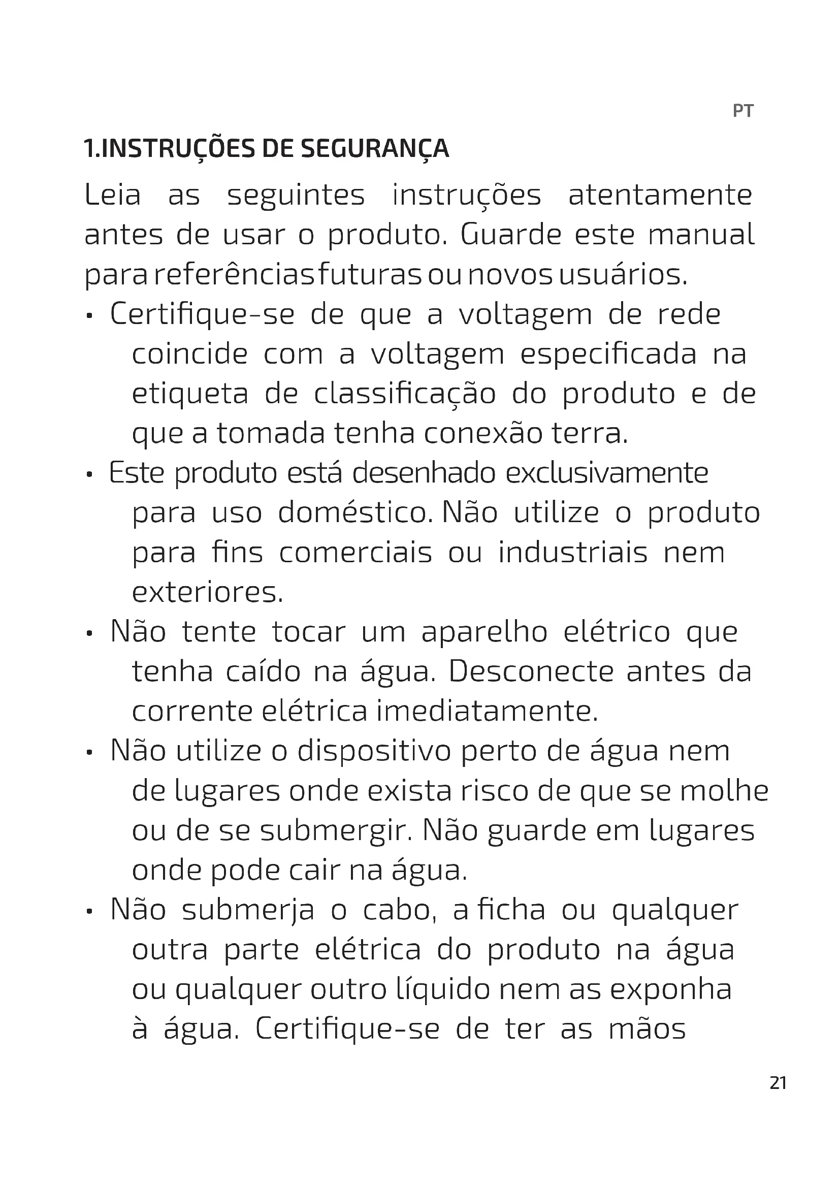 - Não submerja o cabo, a cha ou qualquer outra parte elétrica do produto na água ou qualquer outro líquido nem as exponha à água. Certique-se de ter as mãosPT