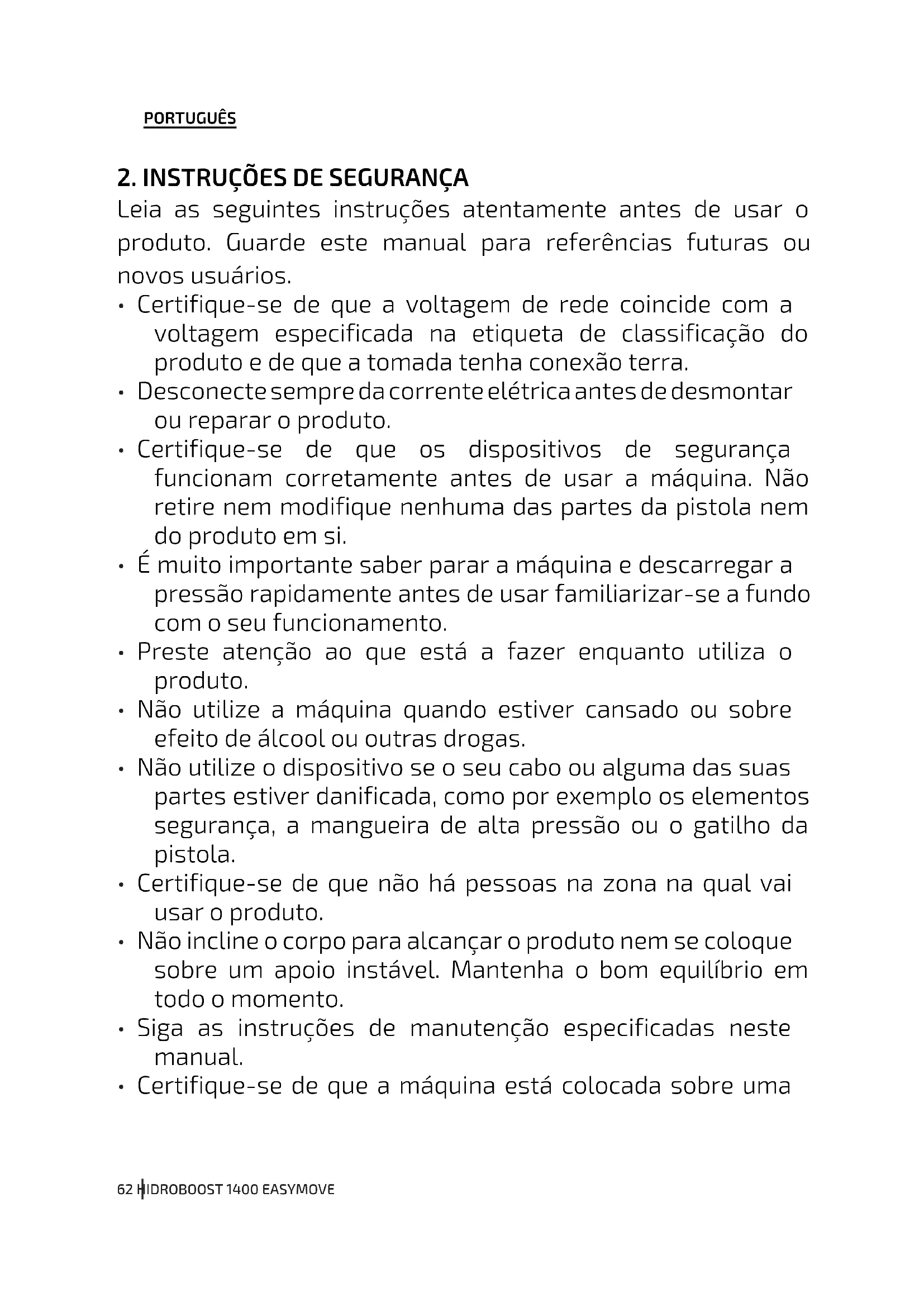 - Uma vez desligado o produto e o fornecimento de água, pressione o gatilho para despressurizar o dispositivo.PORTUGUÊS 70 HIDROBOOST 1400 EASYMOVE ADVERTÊNCIA: