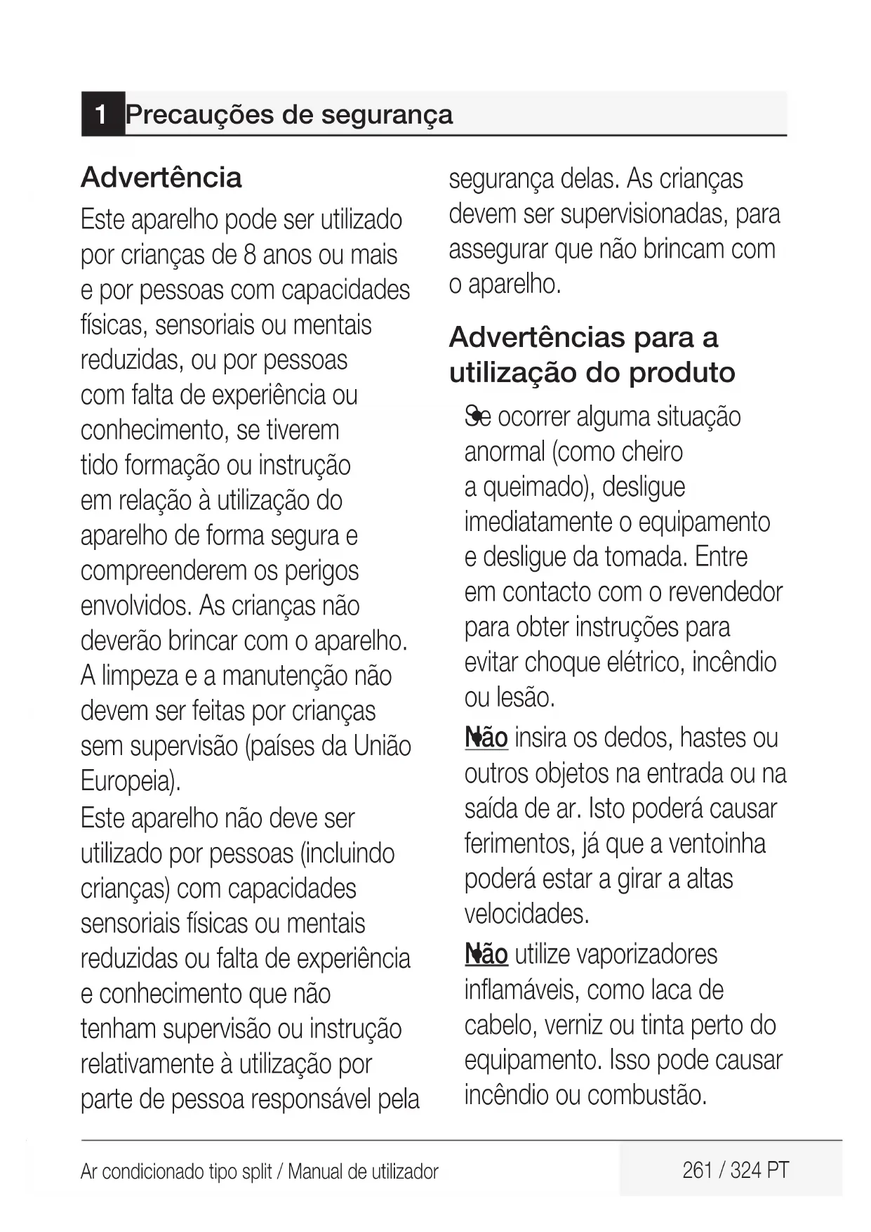 1 Precauções de segurançaAr condicionado tipo split / Manual de utilizador 269 / 324 PT