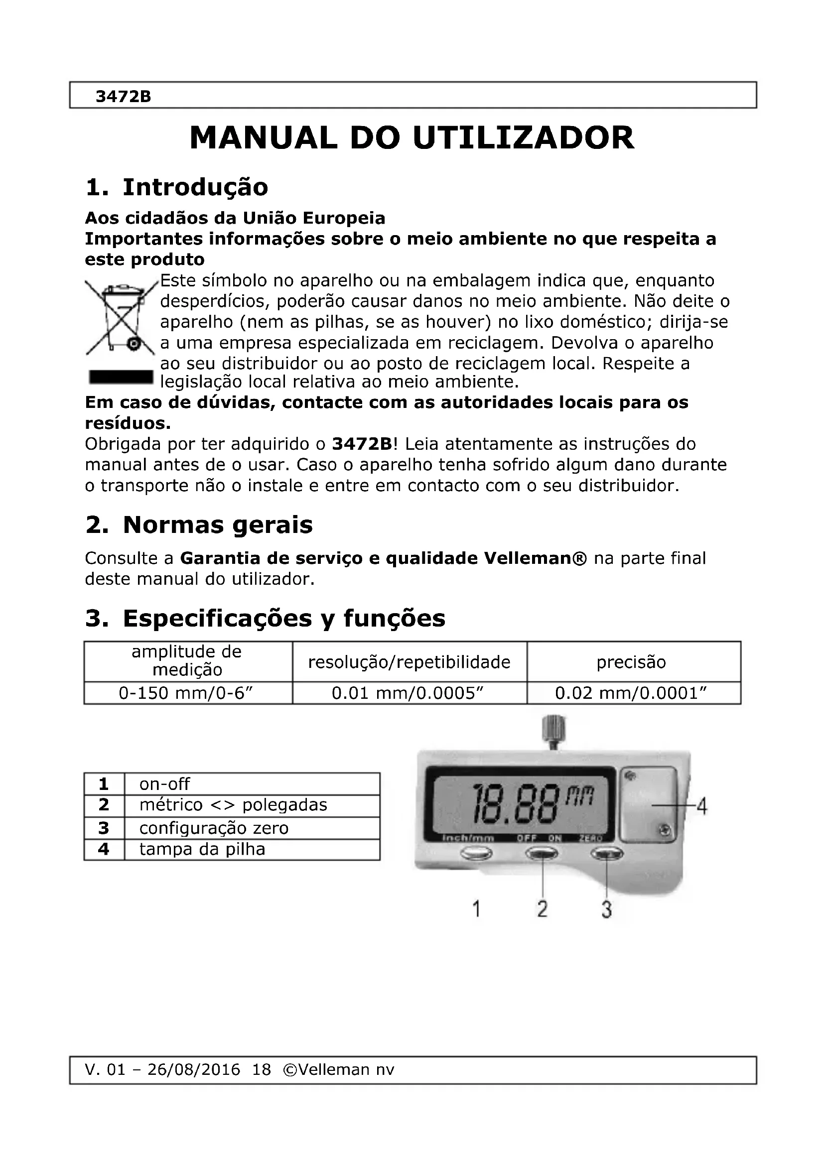 Aos cidadãos da União Europeia Importantes informações sobre o meio ambiente no que respeita a este produto Este símbolo no aparelho ou na embalagem indica que, enquanto desperdícios, poderão causar danos no meio ambiente. Não deite o aparelho (nem as pilhas, se as houver) no lixo doméstico; dirija-se a uma empresa especializada em reciclagem. Devolva o aparelho ao seu distribuidor ou ao posto de reciclagem local. Respeite a legislação local relativa ao meio ambiente. Em caso de dúvidas, contacte com as autoridades locais para os resíduos. Obrigada por ter adquirido o 3472B! Leia atentamente as instruções do manual antes de o usar. Caso o aparelho tenha sofrido algum dano durante o transporte não o instale e entre em contacto com o seu distribuidor.