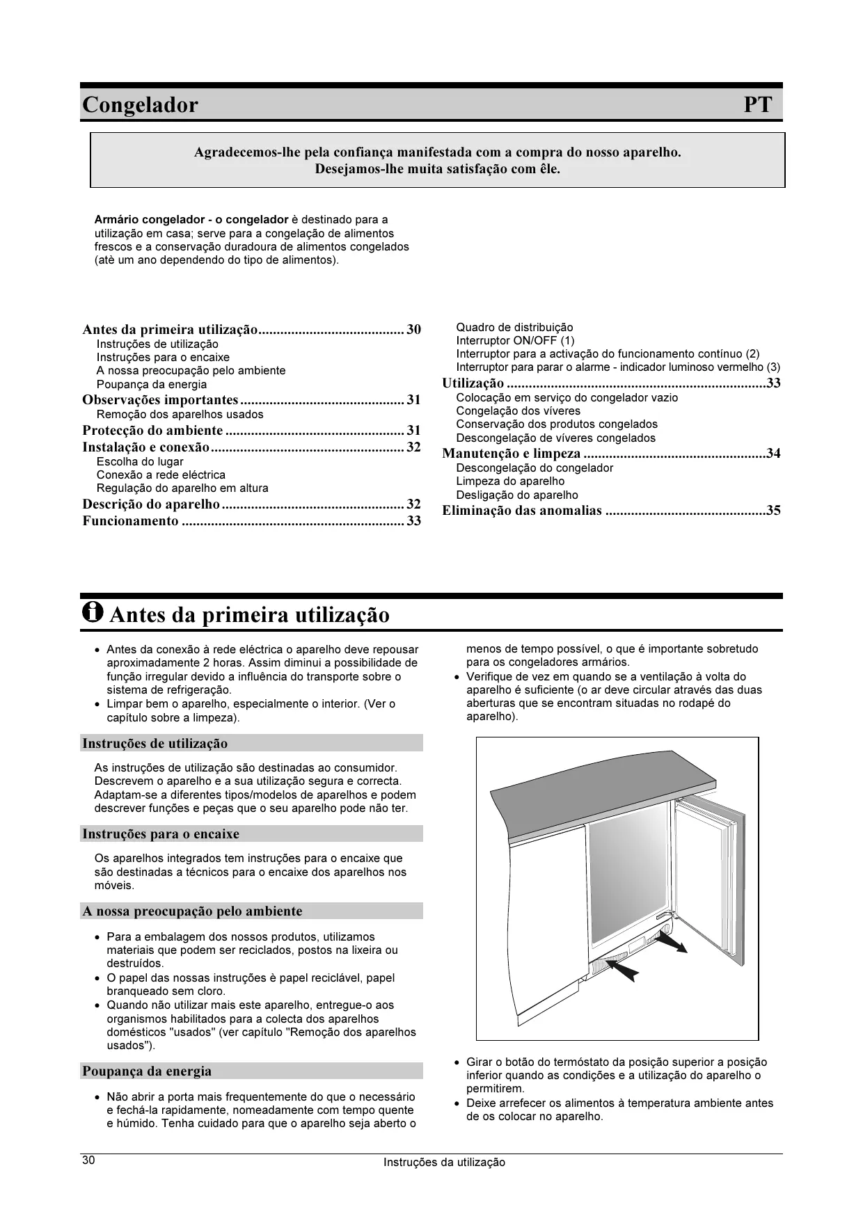 - Agradecemos-lhe pela confiança manifestada com a compra do nosso aparelho. Desejamos-lhe muita satisfação com êle. Armário congelador - o congelador è destinado para a utilização em casa; serve para a congelação de alimentos frescos e a conservação duradoura de alimentos congelados (atè um ano dependendo do tipo de alimentos). Antes da primeira utilização p. 30