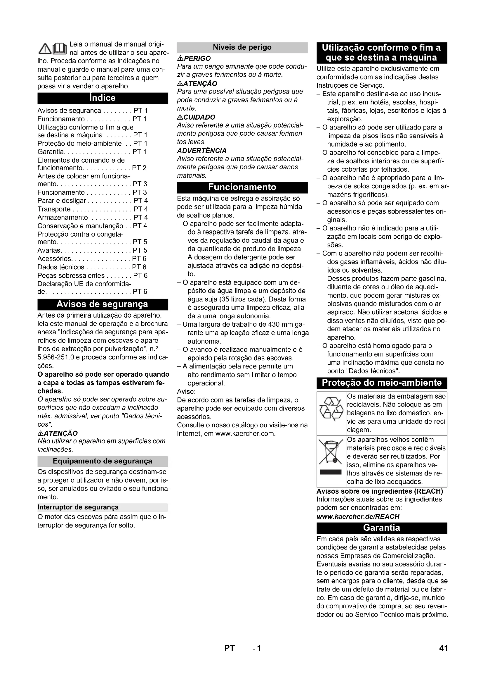 Chairman of the Board of Management Director Regulatory Affairs & Certification 40 ES- 1 Leia o manual de manual origi- nal antes de utilizar o seu apare- lho. Proceda conforme as indicações no manual e guarde o manual para uma con- sulta posterior ou para terceiros a quem possa vir a vender o aparelho. Antes da primeira utilização do aparelho, leia este manual de operação e a brochura anexa "Indicações de segurança para apa- relhos de limpeza com escovas e apare- lhos de extracção por pulverização", n.º 5.956-251.0 e proceda conforme as indica- ções. O aparelho só pode ser operado quando a capa e todas as tampas estiverem fe- chadas. O aparelho só pode ser operado sobre su- perfícies que não excedam a inclinação máx. admissível, ver ponto "Dados técni- cos". 몇 ATENÇÃO Não utilizar o aparelho em superfícies com inclinações. Os dispositivos de segurança destinam-se a proteger o utilizador e não devem, por is- so, ser anulados ou evitado o seu funciona- mento. O motor das escovas pára assim que o in- terruptor de segurança for solto. PERIGO Para um perigo eminente que pode condu- zir a graves ferimentos ou à morte. 몇 ATENÇÃO Para uma possível situação perigosa que pode conduzir a graves ferimentos ou à morte. 몇 CUIDADO Aviso referente a uma situação potencial- mente perigosa que pode causar ferimen- tos leves. ADVERTÊNCIA Aviso referente a uma situação potencial- mente perigosa que pode causar danos materiais. Esta máquina de esfrega e aspiração só pode ser utilizada para a limpeza húmida de soalhos planos. – O aparelho pode ser facilmente adapta- do à respectiva tarefa de limpeza, atra- vés da regulação do caudal da água e da quantidade de produto de limpeza. A dosagem do detergente pode ser ajustada através da adição no depósi- to. – O aparelho está equipado com um de- pósito de água limpa e um depósito de água suja (35 litros cada). Desta forma é assegurada uma limpeza eficaz, alia- da a uma longa autonomia. – Uma largura de trabalho de 430 mm ga- rante uma aplicação eficaz e uma longa autonomia. – O avanço é realizado manualmente e é apoiado pela rotação das escovas. – A alimentação pela rede permite um alto rendimento sem limitar o tempo operacional. Aviso: De acordo com as tarefas de limpeza, o aparelho pode ser equipado com diversos acessórios. Consulte o nosso catálogo ou visite-nos na Internet, em www.kaercher.com. Utilize este aparelho exclusivamente em conformidade com as indicações destas Instruções de Serviço. – Este aparelho destina-se ao uso indus- trial, p.ex. em hotéis, escolas, hospi- tais, fábricas, lojas, escritórios e lojas à exploração. – O aparelho só pode ser utilizado para a limpeza de pisos lisos não sensíveis à humidade e ao polimento. – O aparelho foi concebido para a limpe- za de soalhos interiores ou de superfí- cies cobertas por telhados. – O aparelho não é apropriado para a lim- peza de solos congelados (p. ex. em ar- mazéns frigoríficos). – O aparelho só pode ser equipado com acessórios e peças sobressalentes ori- ginais. – O aparelho não é indicado para a utili- zação em locais com perigo de explo- sões. – Com o aparelho não podem ser recolhi- dos gases inflamáveis, ácidos não dilu- ídos ou solventes. Desses produtos fazem parte gasolina, diluente de cores ou óleo de aqueci- mento, que podem gerar misturas ex- plosivas quando misturados com o ar aspirado. Não utilizar acetona, ácidos e dissolventes não diluídos, visto que po- dem atacar os materiais utilizados no aparelho. – O aparelho está homologado para o funcionamento em superfícies com uma inclinação máxima que consta no ponto "Dados técnicos". Avisos sobre os ingredientes (REACH) Informações atuais sobre os ingredientes podem ser encontradas em: www.kaercher.de/REACH Em cada país são válidas as respectivas condições de garantia estabelecidas pelas nossas Empresas de Comercialização. Eventuais avarias no seu acessório duran- te o período de garantia serão reparadas, sem encargos para o cliente, desde que se trate de um defeito de material ou de fabri- co. Em caso de garantia, dirija-se, munido do comprovativo de compra, ao seu reven- dedor ou ao Serviço Técnico mais próximo. Índice Avisos de segurança . . . . . . . . PT 1 Funcionamento . . . . . . . . . . . . PT 1 Utilização conforme o fim a que se destina a máquina . . . . . . . PT 1 Proteção do meio-ambiente . . PT 1 Garantia. . . . . . . . . . . . . . . . . . PT 1 Elementos de comando e de funcionamento. . . . . . . . . . . . . PT 2 Antes de colocar em funciona- mento. . . . . . . . . . . . . . . . . . . . PT 3 Funcionamento . . . . . . . . . . . . PT 3 Parar e desligar . . . . . . . . . . . . PT 4 Transporte . . . . . . . . . . . . . . . . PT 4 Armazenamento . . . . . . . . . . . PT 4 Conservação e manutenção . . PT 4 Protecção contra o congela- mento. . . . . . . . . . . . . . . . . . . . PT 5 Avarias. . . . . . . . . . . . . . . . . . . PT 5 Acessórios. . . . . . . . . . . . . . . . PT 6 Dados técnicos . . . . . . . . . . . . PT 6 Peças sobressalentes . . . . . . . PT 6 Declaração UE de conformida- de. . . . . . . . . . . . . . . . . . . . . . . PT 6 Avisos de segurança Equipamento de segurança Interruptor de segurança Níveis de perigo Funcionamento Utilização conforme o fim a que se destina a máquina Proteção do meio-ambiente Os materiais da embalagem são recicláveis. Não coloque as em- balagens no lixo doméstico, en- vie-as para uma unidade de reci- clagem. Os aparelhos velhos contêm materiais preciosos e recicláveis e deverão ser reutilizados. Por isso, elimine os aparelhos ve- lhos através de sistemas de re- colha de lixo adequados. Garantia 41PT- 2 1 filtro de fiocos 2 Interruptor de segurança 3 Mangueira de descarga da água suja com o dispositivo de dosagem 4 Calha de imobilização para Homebase 5 Flutuador 6 Tanque de água fresca 7 Fe