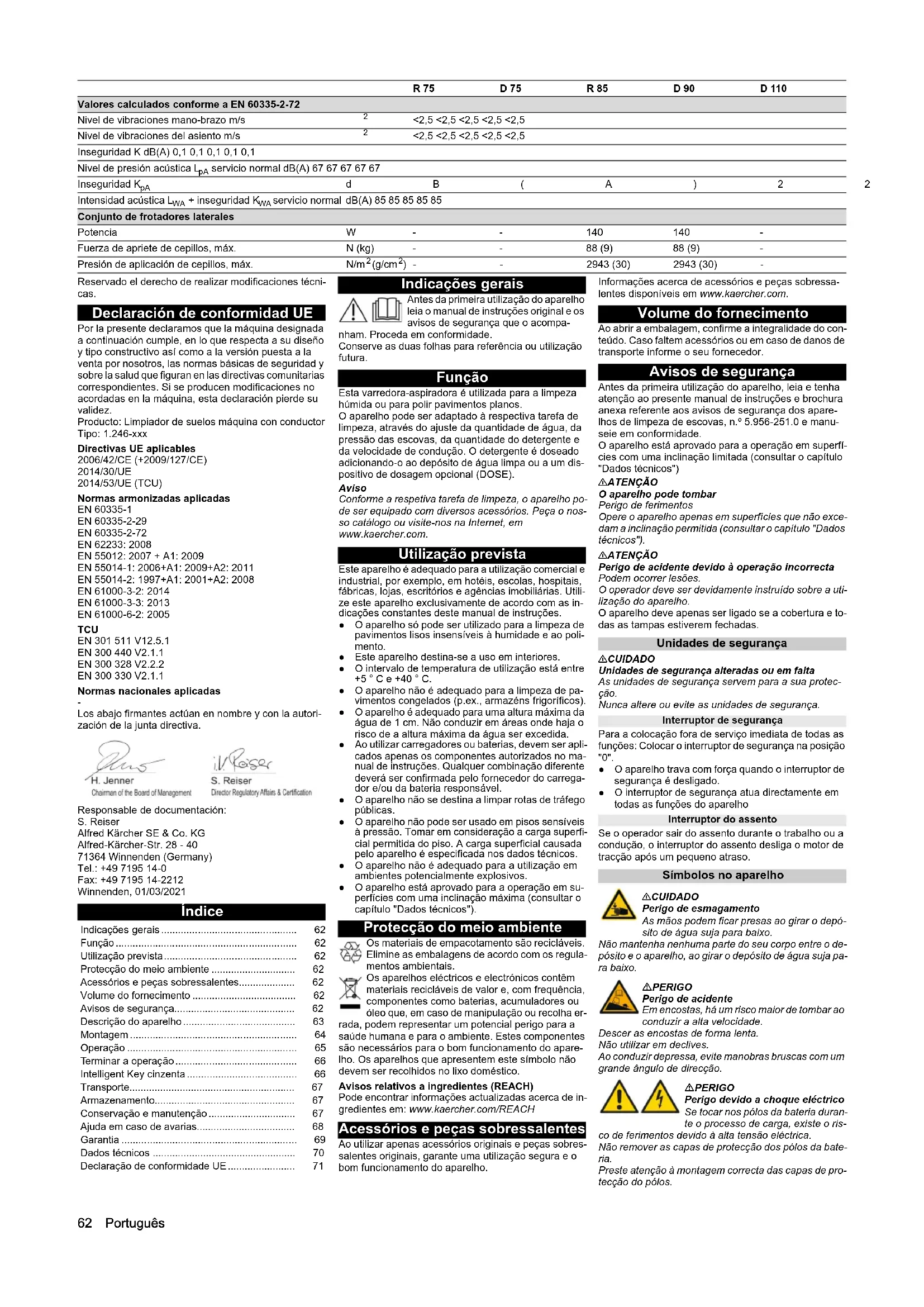 Los abajo firmantes actúan en nombre y con la autori- zación de la junta directiva. Responsable de documentación: S. Reiser Alfred Kärcher SE & Co. KG Alfred-Kärcher-Str. 28 - 40 71364 Winnenden (Germany) Tel.: +49 7195 14-0 Fax: +49 7195 14-2212 Winnenden, 01/03/2021 Índice Indicações gerais Antes da primeira utilização do aparelho leia o manual de instruções original e os avisos de segurança que o acompa- nham. Proceda em conformidade. Conserve as duas folhas para referência ou utilização futura. Função Esta varredora-aspiradora é utilizada para a limpeza húmida ou para polir pavimentos planos. O aparelho pode ser adaptado à respectiva tarefa de limpeza, através do ajuste da quantidade de água, da pressão das escovas, da quantidade do detergente e da velocidade de condução. O detergente é doseado adicionando-o ao depósito de água limpa ou a um dis- positivo de dosagem opcional (DOSE). Aviso Conforme a respetiva tarefa de limpeza, o aparelho po- de ser equipado com diversos acessórios. Peça o nos- so catálogo ou visite-nos na Internet, em www.kaercher.com. Utilização prevista Este aparelho é adequado para a utilização comercial e industrial, por exemplo, em hotéis, escolas, hospitais, fábricas, lojas, escritórios e agências imobiliárias. Utili- ze este aparelho exclusivamente de acordo com as in- dicações constantes deste manual de instruções. ● O aparelho só pode ser utilizado para a limpeza de pavimentos lisos insensíveis à humidade e ao poli- mento. ● Este aparelho destina-se a uso em interiores. ● O intervalo de temperatura de utilização está entre +5 ° C e +40 ° C. ● O aparelho não é adequado para a limpeza de pa- vimentos congelados (p.ex., armazéns frigoríficos). ● O aparelho é adequado para uma altura máxima da água de 1 cm. Não conduzir em áreas onde haja o risco de a altura máxima da água ser excedida. ● Ao utilizar carregadores ou baterias, devem ser apli- cados apenas os componentes autorizados no ma- nual de instruções. Qualquer combinação diferente deverá ser confirmada pelo fornecedor do carrega- dor e/ou da bateria responsável. ● O aparelho não se destina a limpar rotas de tráfego públicas. ● O aparelho não pode ser usado em pisos sensíveis à pressão. Tomar em consideração a carga superfi- cial permitida do piso. A carga superficial causada pelo aparelho é especificada nos dados técnicos. ● O aparelho não é adequado para a utilização em ambientes potencialmente explosivos. ● O aparelho está aprovado para a operação em su- perfícies com uma inclinação máxima (consultar o capítulo "Dados técnicos"). Protecção do meio ambiente Os materiais de empacotamento são recicláveis. Elimine as embalagens de acordo com os regula- mentos ambientais. Os aparelhos eléctricos e electrónicos contêm materiais recicláveis de valor e, com frequência, componentes como baterias, acumuladores ou óleo que, em caso de manipulação ou recolha er- rada, podem representar um potencial perigo para a saúde humana e para o ambiente. Estes componentes são necessários para o bom funcionamento do apare- lho. Os aparelhos que apresentem este símbolo não devem ser recolhidos no lixo doméstico. Avisos relativos a ingredientes (REACH) Pode encontrar informações actualizadas acerca de in- gredientes em: www.kaercher.com/REACH Acessórios e peças sobressalentes Ao utilizar apenas acessórios originais e peças sobres- salentes originais, garante uma utilização segura e o bom funcionamento do aparelho. Informações acerca de acessórios e peças sobressa- lentes disponíveis em www.kaercher.com. Volume do fornecimento Ao abrir a embalagem, confirme a integralidade do con- teúdo. Caso faltem acessórios ou em caso de danos de transporte informe o seu fornecedor. Avisos de segurança Antes da primeira utilização do aparelho, leia e tenha atenção ao presente manual de instruções e brochura anexa referente aos avisos de segurança dos apare- lhos de limpeza de escovas, n.º 5.956-251.0 e manu- seie em conformidade. O aparelho está aprovado para a operação em superfí- cies com uma inclinação limitada (consultar o capítulo "Dados técnicos") 몇 ATENÇÃO O aparelho pode tombar Perigo de ferimentos Opere o aparelho apenas em superfícies que não exce- dam a inclinação permitida (consultar o capítulo "Dados técnicos"). 몇 ATENÇÃO Perigo de acidente devido à operação incorrecta Podem ocorrer lesões. O operador deve ser devidamente instruído sobre a uti- lização do aparelho. O aparelho deve apenas ser ligado se a cobertura e to- das as tampas estiverem fechadas. Unidades de segurança 몇 CUIDADO Unidades de segurança alteradas ou em falta As unidades de segurança servem para a sua protec- ção. Nunca altere ou evite as unidades de segurança. Interruptor de segurança Para a colocação fora de serviço imediata de todas as funções: Colocar o interruptor de segurança na posição "0". ● O aparelho trava com força quando o interruptor de segurança é desligado. ● O interruptor de segurança atua directamente em todas as funções do aparelho Interruptor do assento Se o operador sair do assento durante o trabalho ou a condução, o interruptor do assento desliga o motor de tracção após um pequeno atraso. Símbolos no aparelho 몇CUIDADO Perigo de esmagamento As mãos podem ficar presas ao girar o depó- sito de água suja para baixo. Não mantenha nenhuma parte do seu corpo entre o de- pósito e o aparelho, ao girar o depósito de água suja pa- ra baixo. PERIGO Perigo de acidente Em encostas, há um risco maior de tombar ao conduzir a alta velocidade. Descer as encostas de forma lenta. Não utilizar em declives. Ao conduzir depressa, evite manobras bruscas com um grande ângulo de direcção. PERIGO Perigo devido a choque eléctrico Se tocar nos pólos da bateria duran- te o processo de carga, existe o ris- co de ferimentos devido à alta tens