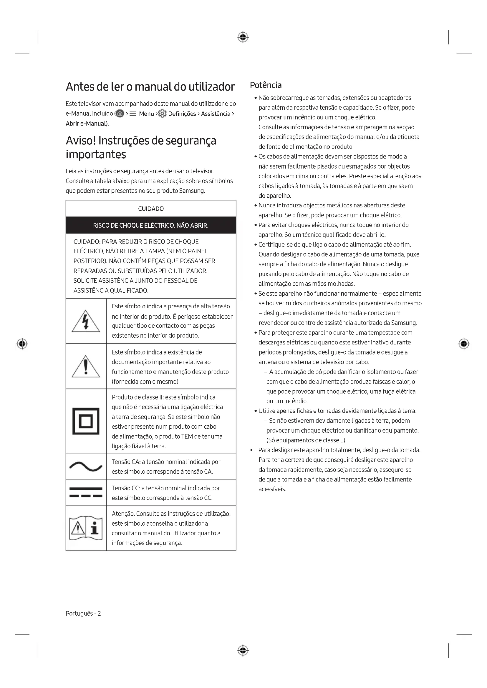 - Por su propia seguridad, no intente extraer la batería. Si no se extrae correctamente, tanto esta como el dispositivo podrían deteriorarse y causarle daños personales o comprometer su seguridad al utilizar el dispositivo. Español - 8Esta página se ha dejado intencionadamente en blanco.Antes de ler o manual do utilizador Este televisor vem acompanhado deste manual do utilizador e do e-Manual incluído ( > Menu > Definições > Assistência > Abrir e-Manual). Aviso! Instruções de segurança importantes Leia as instruções de segurança antes de usar o televisor. Consulte a tabela abaixo para uma explicação sobre os símbolos que podem estar presentes no seu produto Samsung. CUIDADO RISCO DE CHOQUE ELÉCTRICO. NÃO ABRIR. CUIDADO: PARA REDUZIR O RISCO DE CHOQUE ELÉCTRICO, NÃO RETIRE A TAMPA (NEM O PAINEL POSTERIOR). NÃO CONTÉM PEÇAS QUE POSSAM SER REPARADAS OU SUBSTITUÍDAS PELO UTILIZADOR. SOLICITE ASSISTÊNCIA JUNTO DO PESSOAL DE ASSISTÊNCIA QUALIFICADO. Este símbolo indica a presença de alta tensão no interior do produto. É perigoso estabelecer qualquer tipo de contacto com as peças existentes no interior do produto. Este símbolo indica a existência de documentação importante relativa ao funcionamento e manutenção deste produto (fornecida com o mesmo). Produto de classe II: este símbolo indica que não é necessária uma ligação eléctrica à terra de segurança. Se este símbolo não estiver presente num produto com cabo de alimentação, o produto TEM de ter uma ligação fiável à terra. Tensão CA: a tensão nominal indicada por este símbolo corresponde à tensão CA. Tensão CC: a tensão nominal indicada por este símbolo corresponde à tensão CC. Atenção. Consulte as instruções de utilização: este símbolo aconselha o utilizador a consultar o manual do utilizador quanto a informações de segurança. Potência