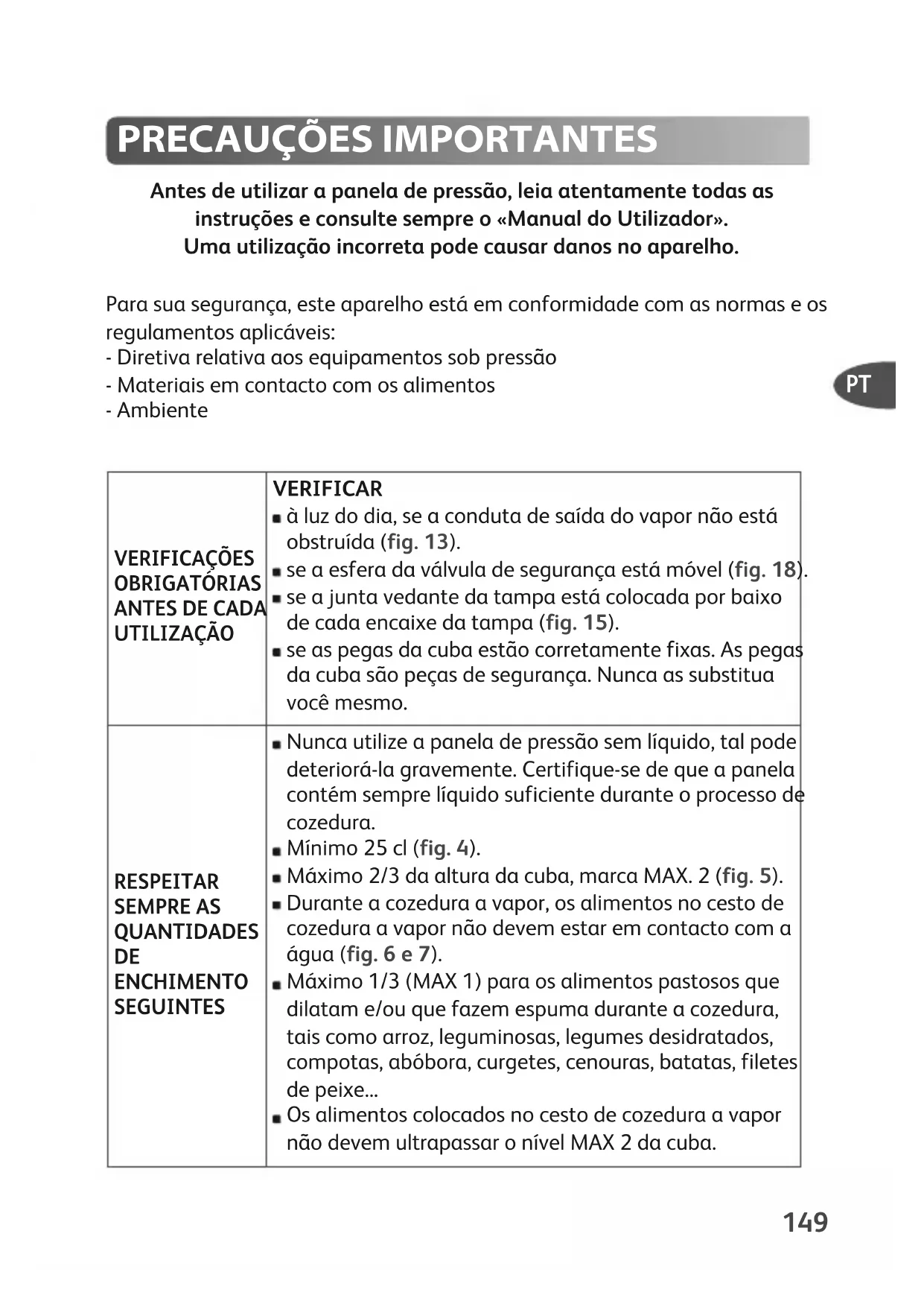 ENCHIMENTO SEGUINTES Nunca utilize a panela de pressão sem líquido, tal pode deteriorá-la gravemente. Certifique-se de que a panela contém sempre líquido suficiente durante o processo de cozedura. Mínimo 25 cl (fig. 4). Máximo 2/3 da altura da cuba, marca MAX. 2 (fig. 5). Durante a cozedura a vapor, os alimentos no cesto de cozedura a vapor não devem estar em contacto com a água (fig. 6 e 7). Máximo 1/3 (MAX 1) para os alimentos pastosos que dilatam e/ou que fazem espuma durante a cozedura, tais como arroz, leguminosas, legumes desidratados, compotas, abóbora, curgetes, cenouras, batatas, filetes de peixe... Os alimentos colocados no cesto de cozedura a vapor não devem ultrapassar o nível MAX 2 da cuba.150 ANTES E DURANTE A COZEDURA Manter as crianças fora do alcance da panela de pressão quando esta está em plena utilização. A panela de pressão coze sob pressão. Uma utilização incorreta deste aparelho pode provocar queimaduras. Certifique-se de que a panela de pressão está corretamente fechada antes de a utilizar. (Consultar a secção «Fecho».) Durante a cozedura, verifique se a válvula emite um som contínuo. Se não libertar vapor suficiente, despressurize o produto e verifique se a quantidade de líquido presente é suficiente, bem como se existe alguma obstrução na conduta de saída do vapor. Se, após estas verificações, o vapor continuar sem sair, aumente ligeiramente a fonte de calor. Não cozer alimentos que podem obstruir as condutas dos mecanismos de segurança, nomeadamente: - arandos - grão de cevada - flocos de aveia - ervilhas - noodles, massa, esparguete - ruibarbo - groselhas Não utilize a panela de pressão para receitas à base de leite. Numa panela de pressão com cuba em inox, não utilize sal grosso. No final da cozedura, adicione sal fino. Deste modo, evitará o aparecimento de "picadelas" que poderão alterar o fundo da panela de pressão. Não utilize a panela de pressão para fritar alimentos com óleo sob pressão. Não utilize a panela de pressão para outros fins que não aquele a que se destina. Não coloque a panela de pressão num forno quente. Nunca coloque papel de alumínio a tapar uma forma dentro da panela de pressão. Nunca coloque película aderente dentro da panela de pressão Os vapores de álcool são inflamáveis. Deixe ferver durante cerca de dois minutos antes de colocar a tampa. Deve vigiar a panela de pressão, no caso de receitas à base de álcool. Utilize fontes de calor compatíveis, de acordo com as instruções de utilização.151