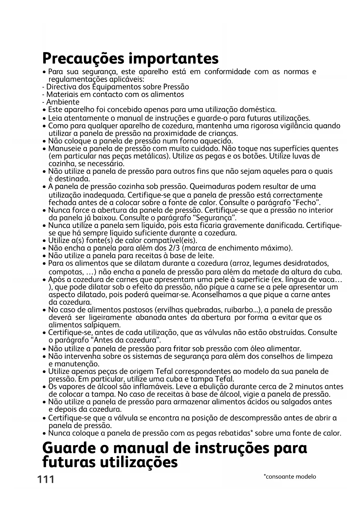 - Nunca coloque a panela de pressão com as pegas rebatidas* sobre uma fonte de calor. Guarde o manual de instruções para futuras utilizações112