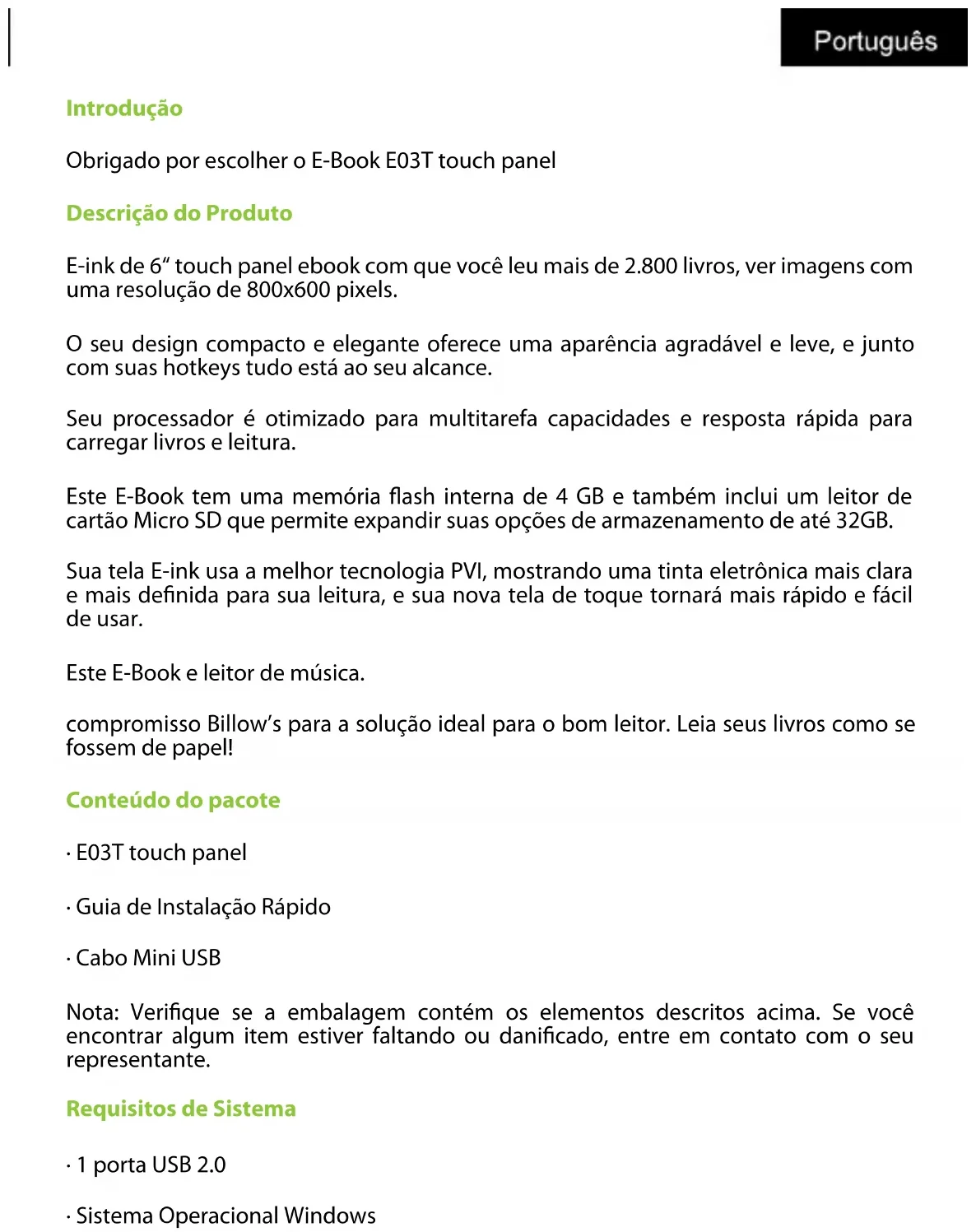 Z menu głównego wybierz podręczniku użytkownika, a następnie naciśnij przycisk OK. Podręcznik użytkownika eBook otworzy. Pomoc techniczna Aby uzyskać więcej informacji na temat tego produktu, prosimy odwiedzić naszą sekcję pomocy na naszej stronie www.billowtechnology.com.Introdução Obrigado por escolher o E-Book E03T touch panel Descrição do Produto E-ink de 6“ touch panel ebook com que você leu mais de 2.800 livros, ver imagens com uma resolução de 800x600 pixels. O seu design compacto e elegante oferece uma aparência agradável e leve, e junto com suas hotkeys tudo está ao seu alcance. Seu processador é otimizado para multitarefa capacidades e resposta rápida para carregar livros e leitura. Este E-Book tem uma memória ash interna de 4 GB e também inclui um leitor de cartão Micro SD que permite expandir suas opções de armazenamento de até 32GB. Sua tela E-ink usa a melhor tecnologia PVI, mostrando uma tinta eletrônica mais clara e mais denida para sua leitura, e sua nova tela de toque tornará mais rápido e fácil de usar. Este E-Book e leitor de música. compromisso Billow’s para a solução ideal para o bom leitor. Leia seus livros como se fossem de papel! Conteúdo do pacote