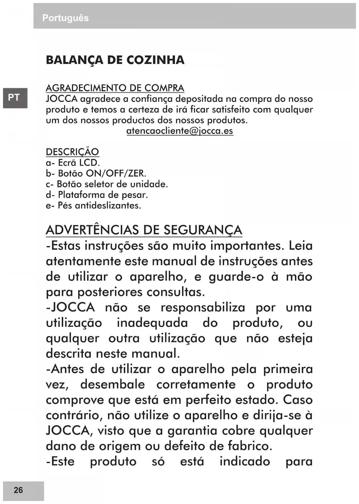 JOCCA agradece a confiança depositada na compra do nosso produto e temos a certeza de irá ficar satisfeito com qualquer um dos nossos productos dos nossos produtos. atencaocliente@jocca.es DESCRIÇÃO a- Ecrã LCD. b- Botão ON/OFF/ZER. c- Botão seletor de unidade. d- Plataforma de pesar. e- Pés antideslizantes.