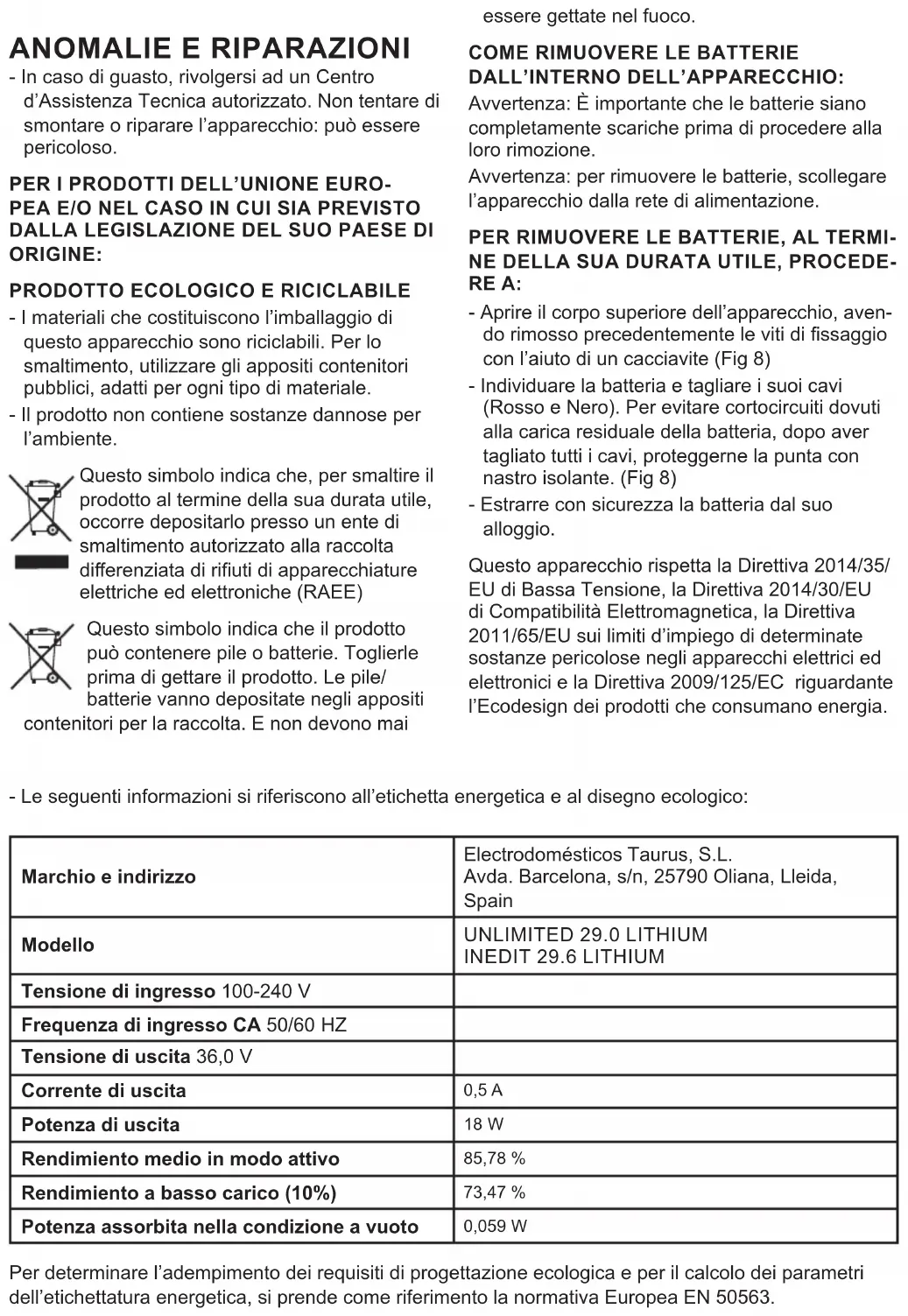 Unlimited 29.0 Lithium - Aspirador TAURUS - Manual de utilização gratuito