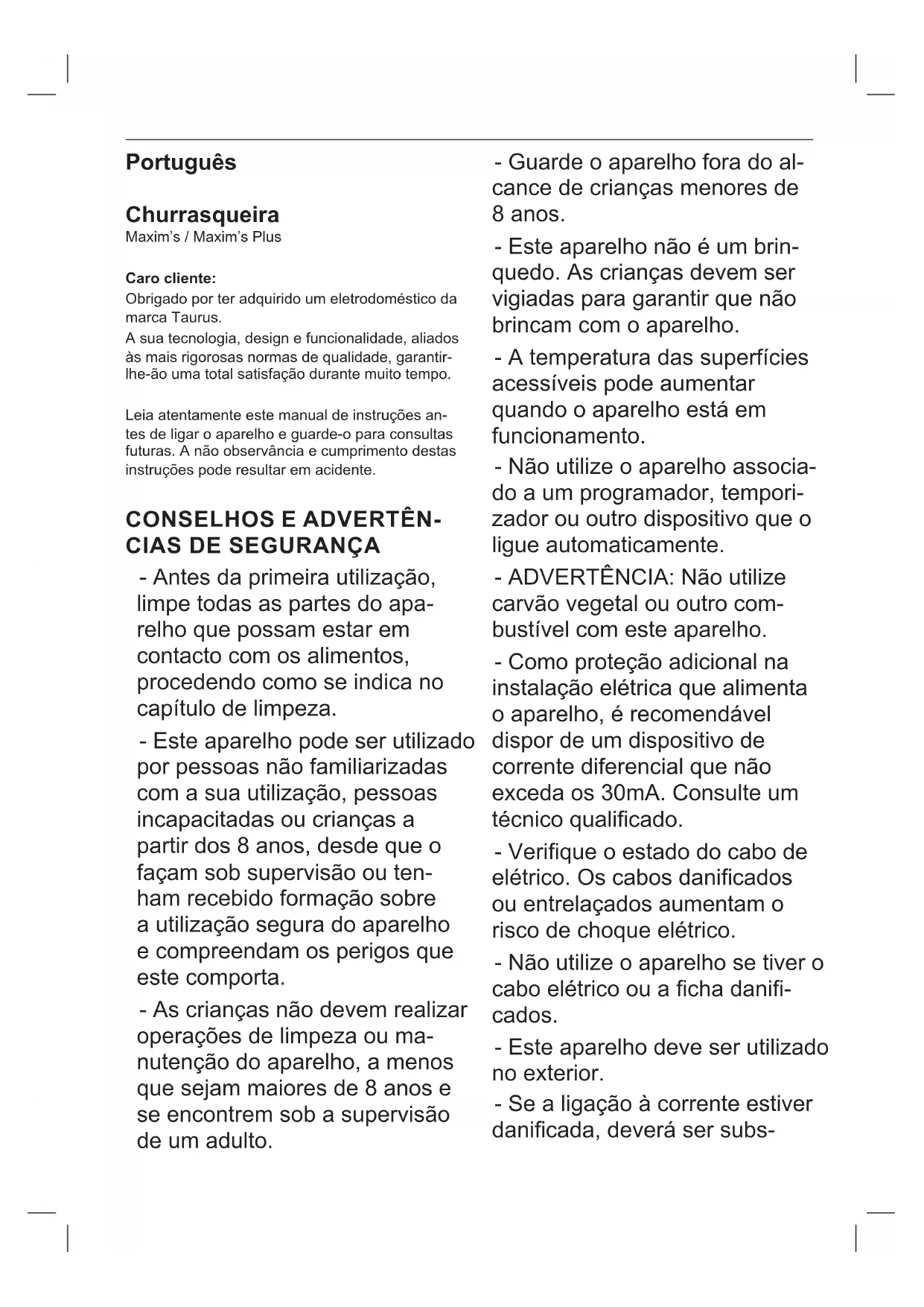 - Os materiais que constituem a embalagem deste aparelho estão integrados num sistema de recolha, classicação e reciclagem. Se desejar eliminá-los, utilize os contentores de reciclagem colocados à disposição para cada tipo de material. - O produto está isento de concentrações de substâncias que podem ser consideradas noci- vas para o ambiente. Este símbolo signica que se desejar desfazer-se do produto depois de terminada a sua vida útil, deve entregá-lo através dos meios adequados ao cuidado de um gestor de resíduos autorizado para a recolha selectiva de Resíduos de Equipamentos Elétricos e Eletróni- cos (REEE). Este aparelho cumpre a Diretiva 2014/35/EC de Baixa Tensão, a Diretiva 2014/30/EC de Com- patibilidade Eletromagnética, a Diretiva 2011/65/ UE sobre restrições à utilização de determinadas substâncias perigosas em aparelhos elétricos e eletrónicos e a Diretiva 2009/125/CE sobre os requisitos de design ecológico aplicável aos produtos relacionados com a energia.Català Barbacoa Maxim’s / Maxim’s Plus Distingit client: Li agraïm que s’hagi decidit per la compra d’un producte de la marca Taurus. La seva tecnologia, disseny i funcionalitat, juntament amb el fet de superar les més estrictes normes de qualitat li comportaran total satisfacció durant molt de temps. Llegir atentament aquest fullet d’instruccions abans de posar l’aparell en marxa i guardar-lo per a posteriors consultes. La no observació i com- pliment d’aquestes instruccions poden comportar com a resultat un accident.