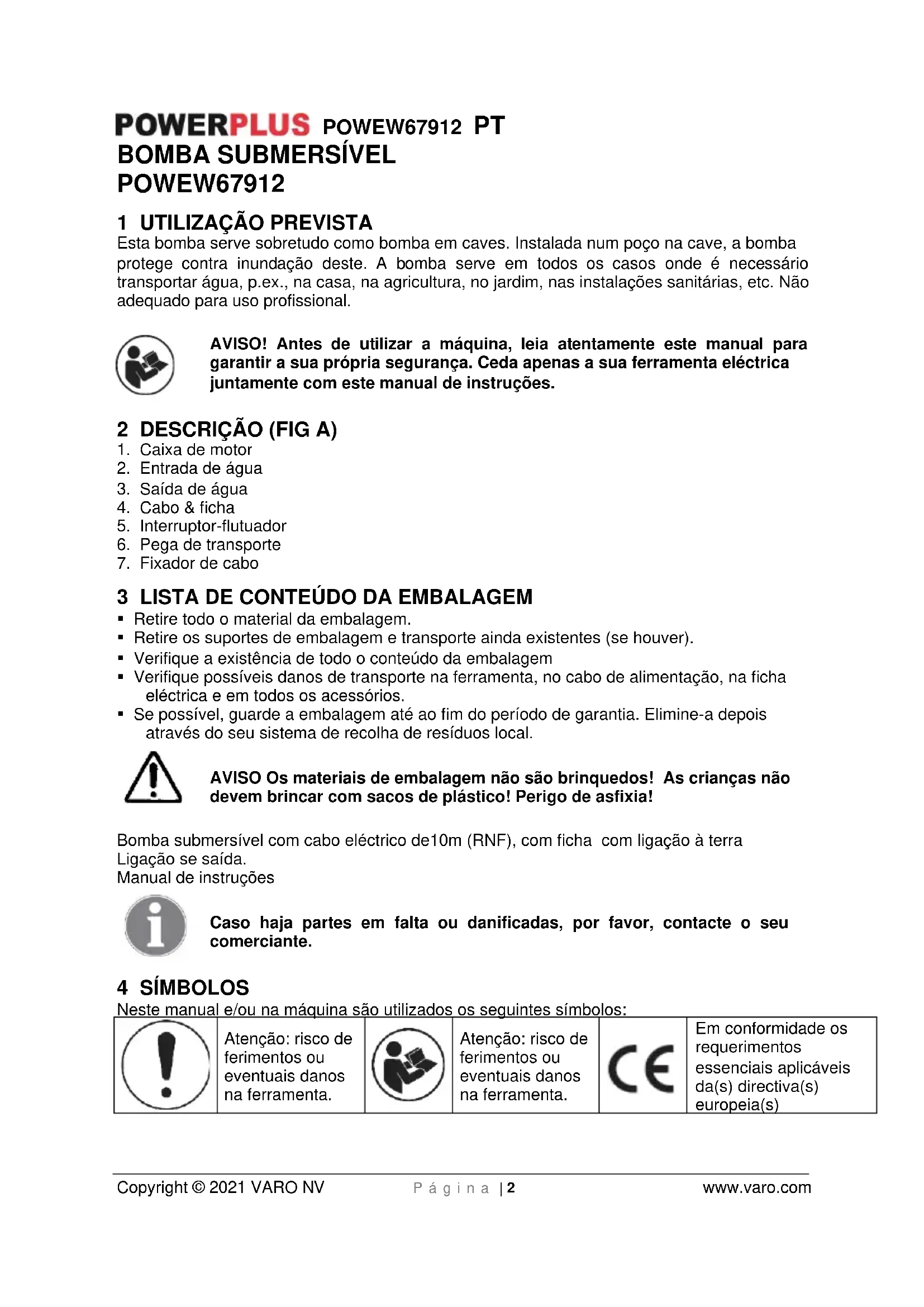 - Ao ajustar o interruptor-flutuador, tenha em atenção que este não deve tocar ao fundo antes da bomba se desligar. Atenção: há perigo de marcha a seco. Este aparelho não é indicado para ser utilizado por crianças e pessoas com capacidades físicas, mentais e psíquicas reduzidas e também não é indicado para pessoas sem experiência ou conhecimentos, só se a pessoa responsável pela segurança destas pessoas explicar previamente a utilização e as disposições de uso relacionadas com este aparelho.POWEW67912 PT Copyright © 2021 VARO NV P á g i n a | 5 www.varo.com