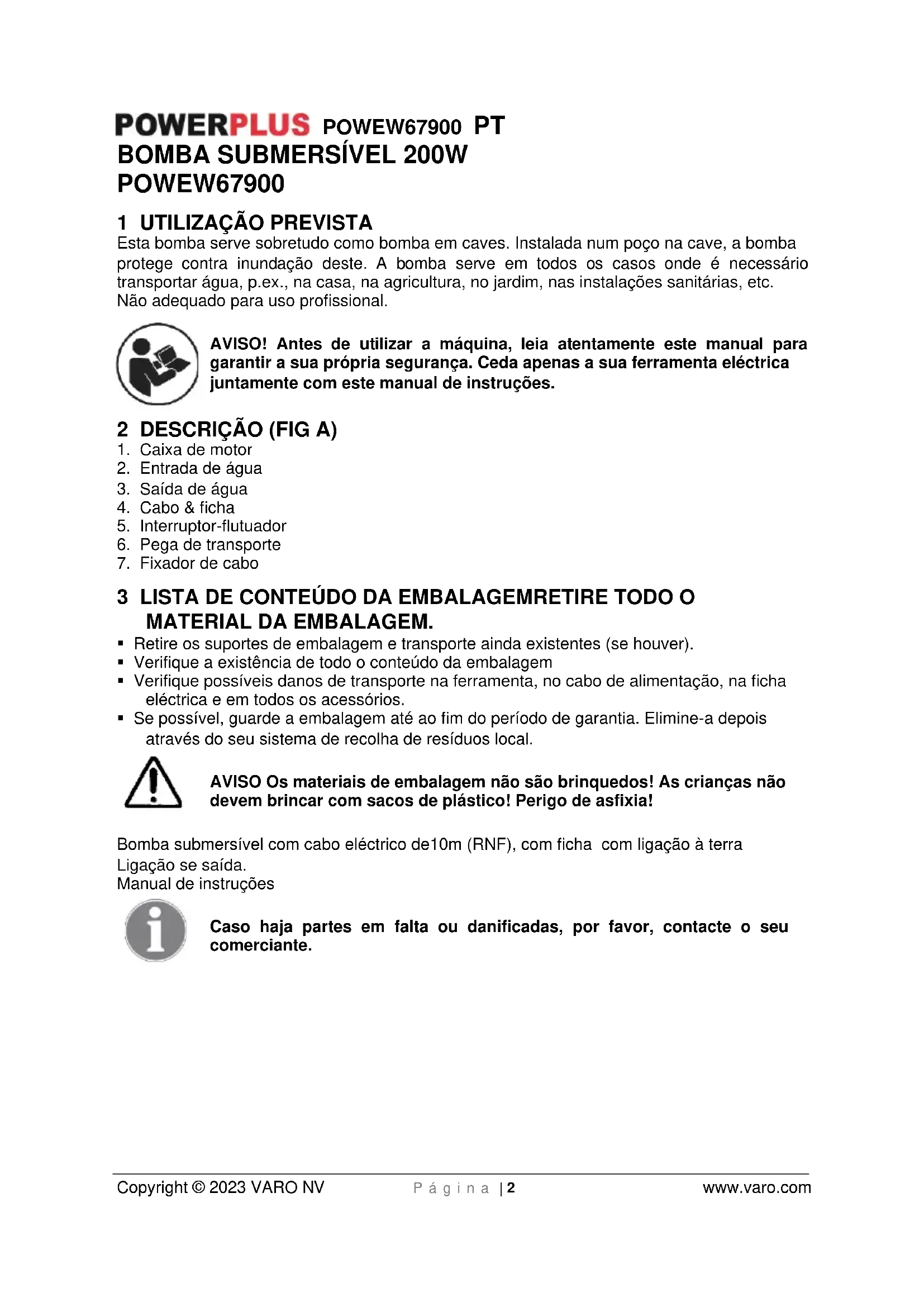 - Se possível, guarde a embalagem até ao fim do período de garantia. Elimine-a depois através do seu sistema de recolha de resíduos local. AVISO Os materiais de embalagem não são brinquedos! As crianças não devem brincar com sacos de plástico! Perigo de asfixia! Bomba submersível com cabo eléctrico de10m (RNF), com ficha com ligação à terra Ligação se saída. Manual de instruções Caso haja partes em falta ou danificadas, por favor, contacte o seu comerciante.POWEW67900 PT Copyright © 2023 VARO NV P á g i n a | 3 www.varo.com 4 SÍMBOLOS Neste manual e/ou na máquina são utilizados os seguintes símbolos: