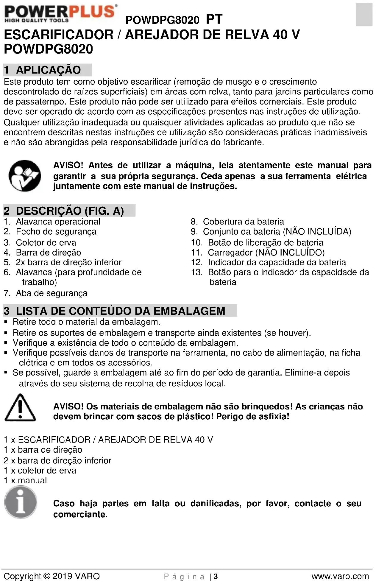 - Se possível, guarde a embalagem até ao fim do período de garantia. Elimine-a depois através do seu sistema de recolha de resíduos local. AVISO! Os materiais de embalagem não são brinquedos! As crianças não devem brincar com sacos de plástico! Perigo de asfixia! 1 x ESCARIFICADOR / AREJADOR DE RELVA 40 V 1 x barra de direção 2 x barra de direção inferior 1 x coletor de erva 1 x manual Caso haja partes em falta ou danificadas, por favor, contacte o seu comerciante.POWDPG8020 PT Copyright © 2019 VARO P á g i n a | 4 www.varo.com 4 SÍMBOLOS Neste manual e/ou na máquina são utilizados os seguintes símbolos: