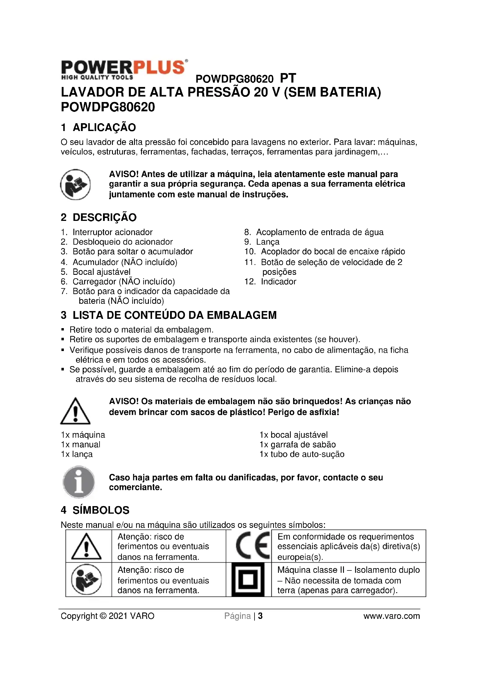 Máquina classe II – Isolamento duplo – Não necessita de tomada com terra (apenas para carregador).POWDPG80620 PT Copyright © 2021 VARO Página | 4 www.varo.com