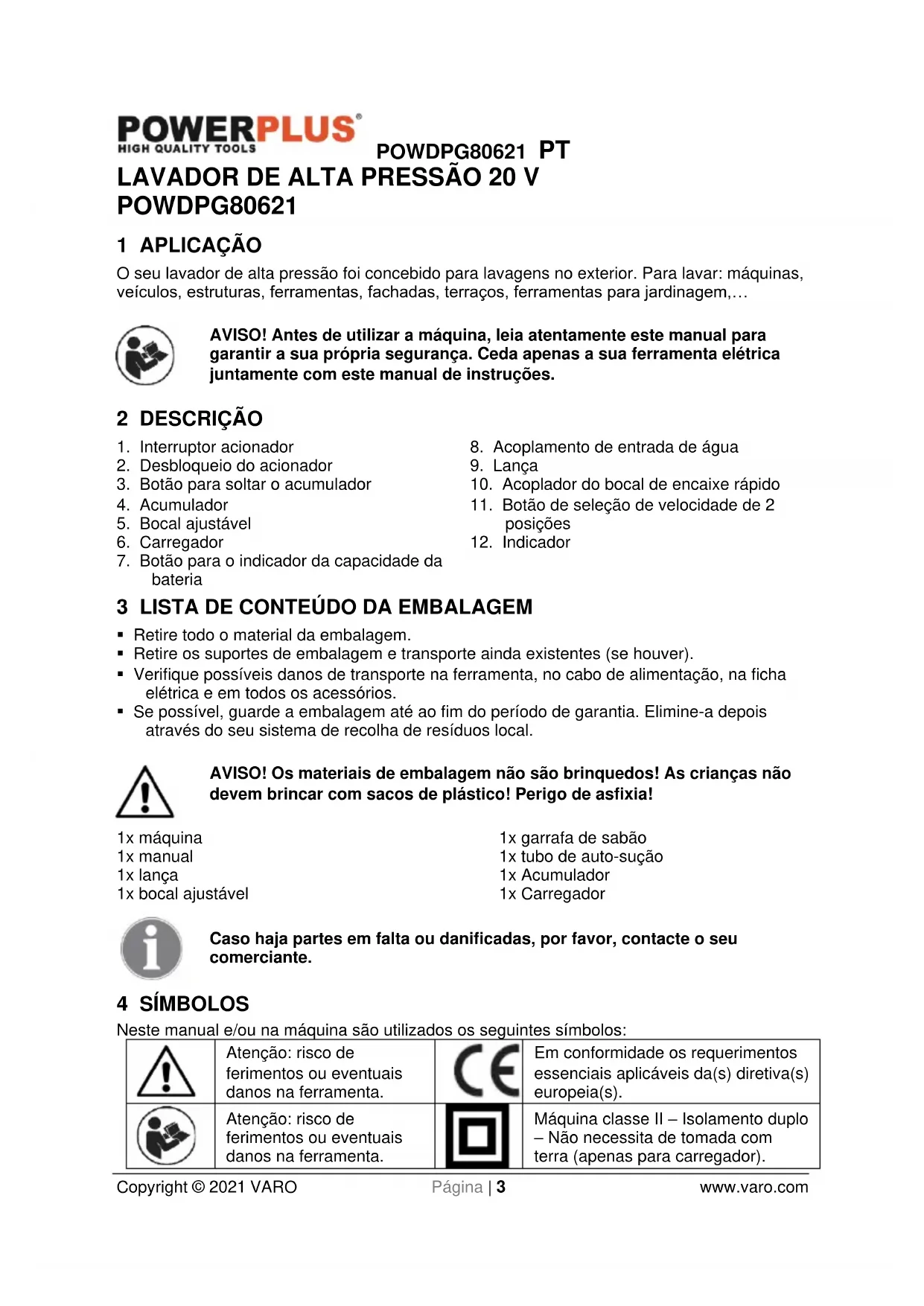 Máquina classe II – Isolamento duplo – Não necessita de tomada com terra (apenas para carregador).POWDPG80621 PT Copyright © 2021 VARO Página | 4 www.varo.com