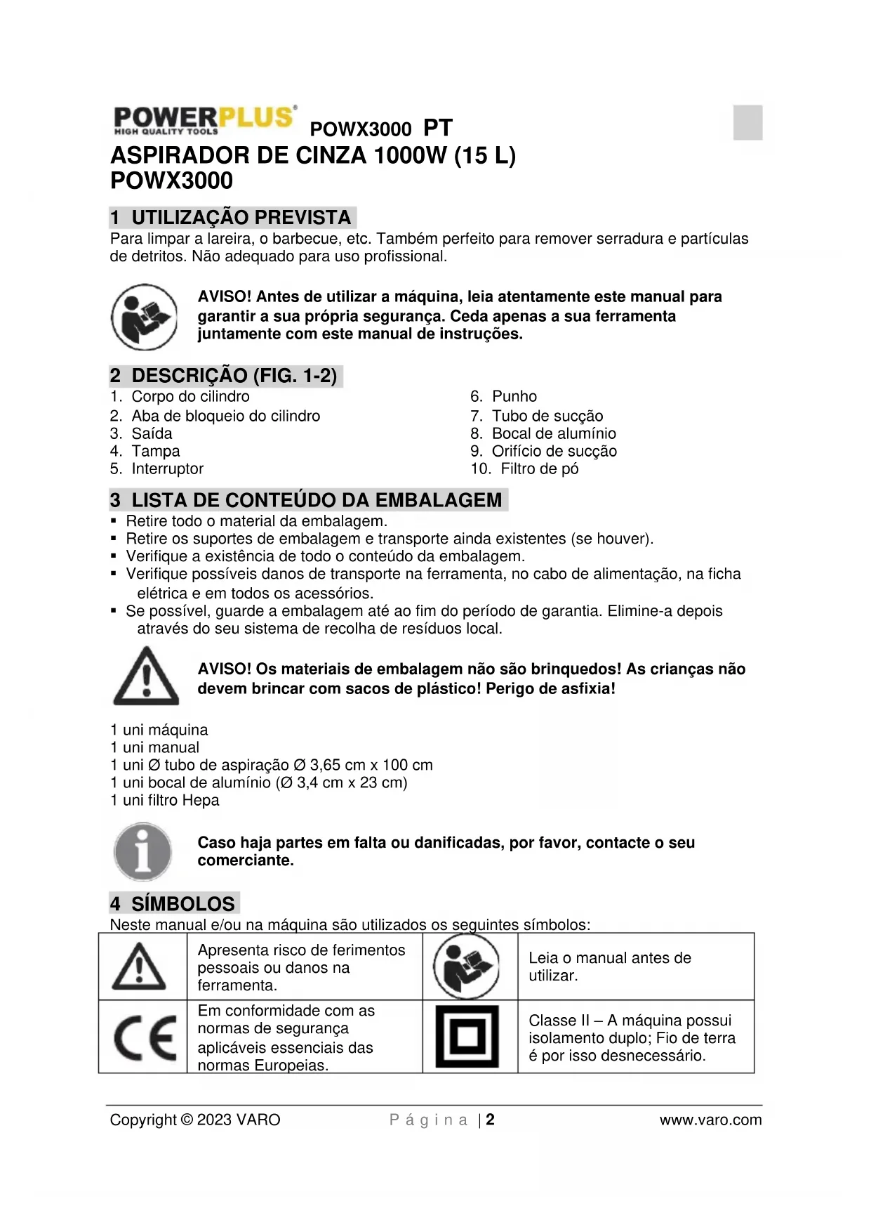 Classe II – A máquina possui isolamento duplo; Fio de terra é por isso desnecessário.POWX3000 PT Copyright © 2023 VARO P á g i n a | 3 www.varo.com
