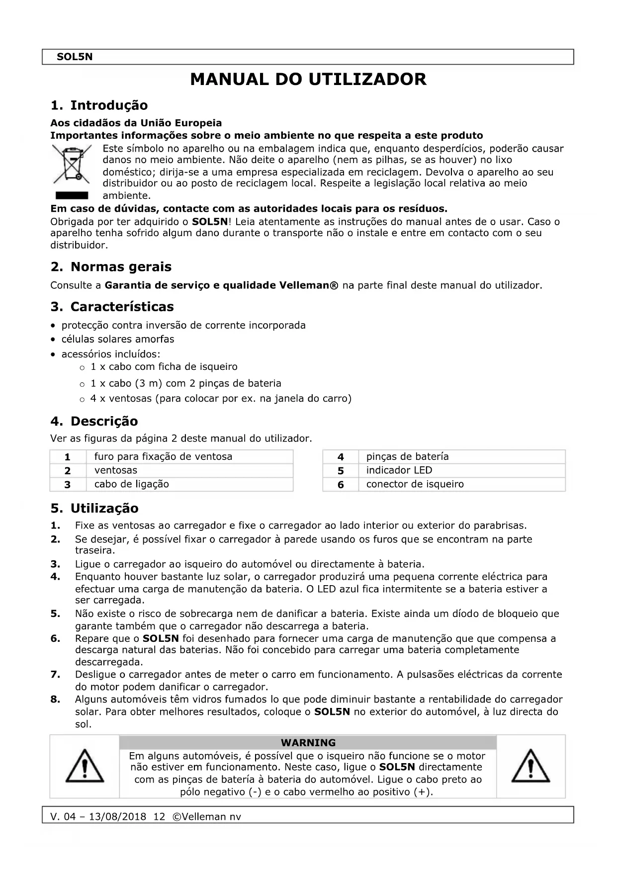 Aos cidadãos da União Europeia Importantes informações sobre o meio ambiente no que respeita a este produto Este símbolo no aparelho ou na embalagem indica que, enquanto desperdícios, poderão causar danos no meio ambiente. Não deite o aparelho (nem as pilhas, se as houver) no lixo doméstico; dirija-se a uma empresa especializada em reciclagem. Devolva o aparelho ao seu distribuidor ou ao posto de reciclagem local. Respeite a legislação local relativa ao meio ambiente. Em caso de dúvidas, contacte com as autoridades locais para os resíduos. Obrigada por ter adquirido o SOL5N! Leia atentamente as instruções do manual antes de o usar. Caso o aparelho tenha sofrido algum dano durante o transporte não o instale e entre em contacto com o seu distribuidor.