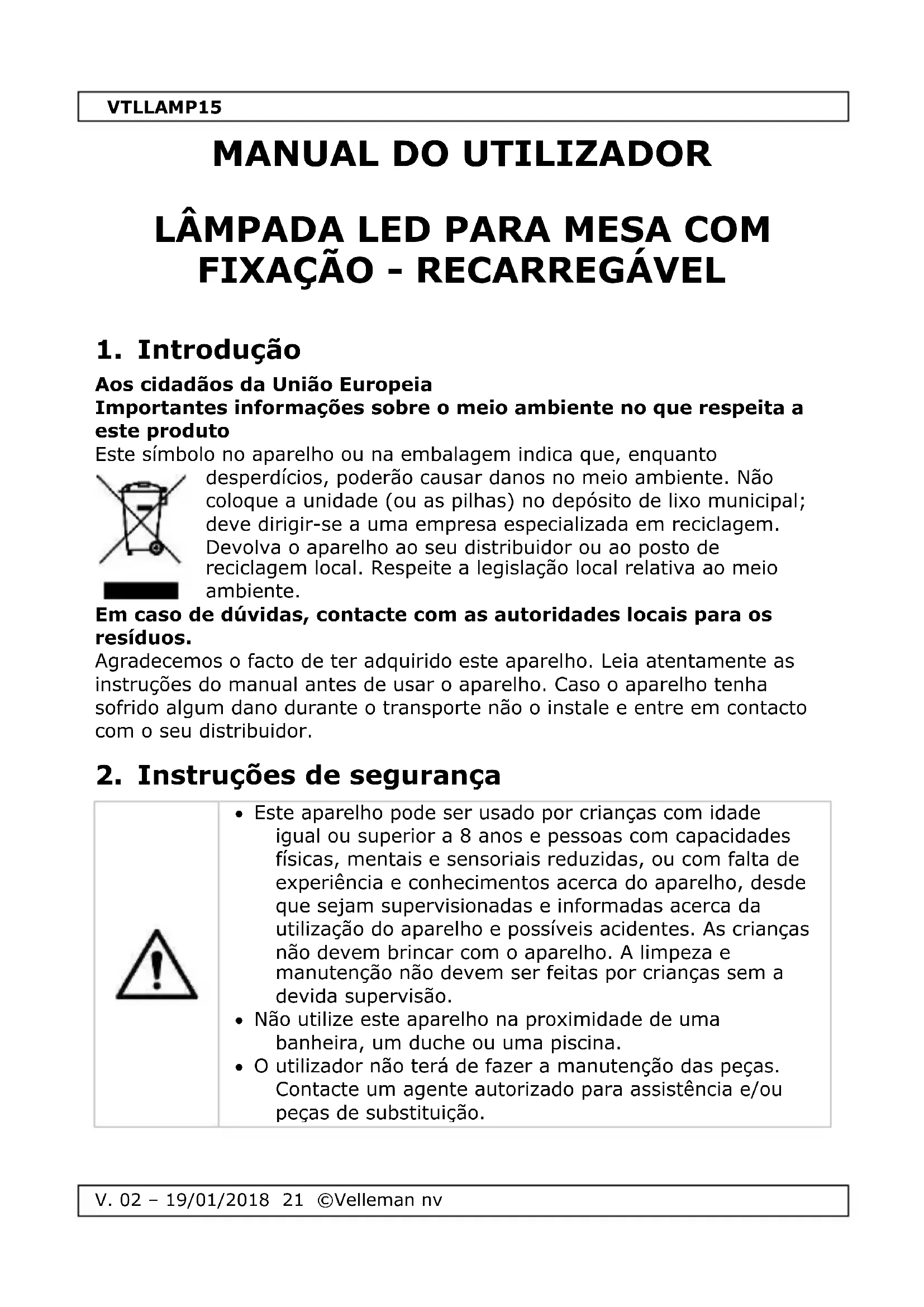 Encontre gratuitamente o manual do aparelho VTLLAMP15 VELLEMAN em formato PDF.