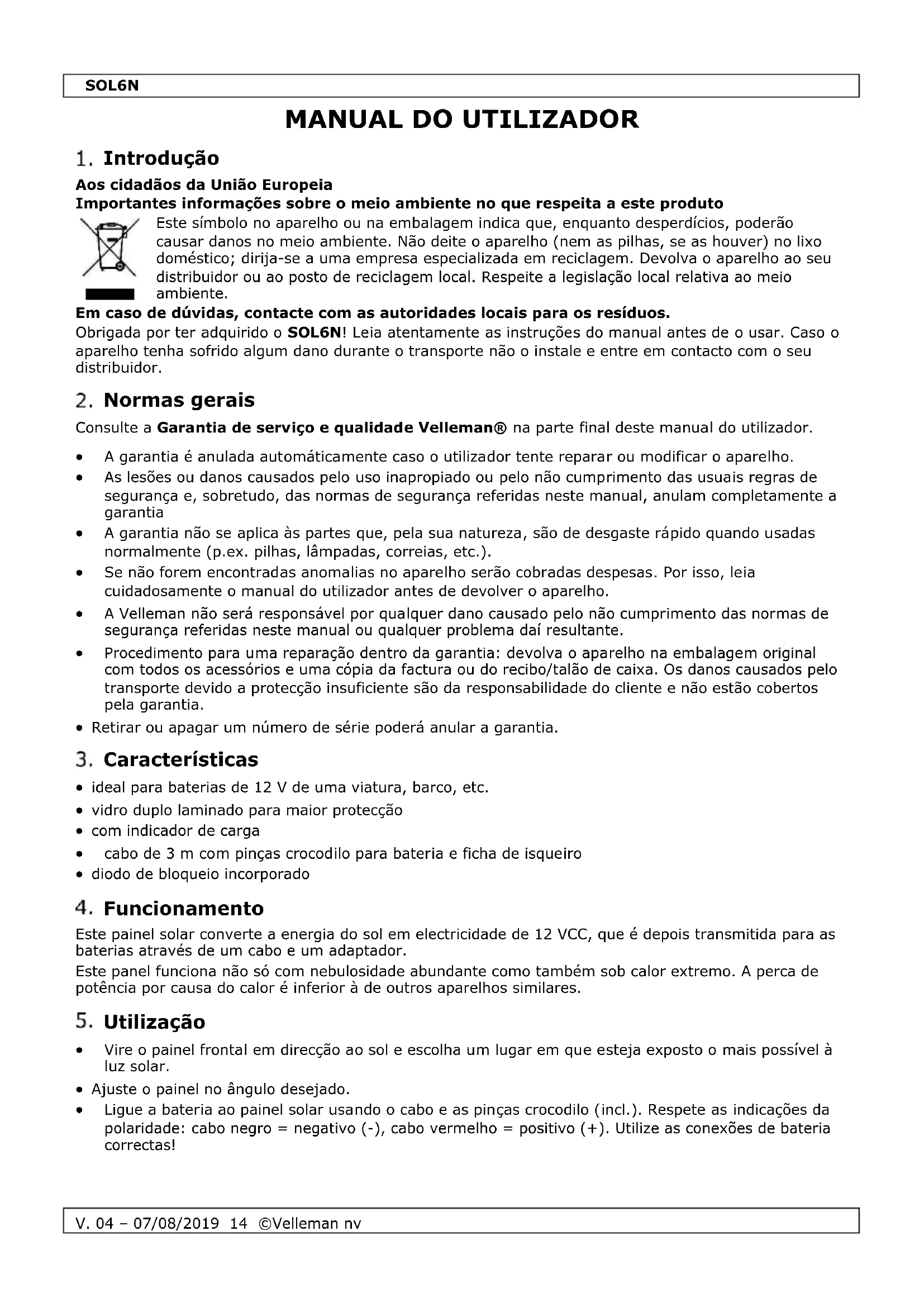 Introdução Aos cidadãos da União Europeia Importantes informações sobre o meio ambiente no que respeita a este produto Este símbolo no aparelho ou na embalagem indica que, enquanto desperdícios, poderão causar danos no meio ambiente. Não deite o aparelho (nem as pilhas, se as houver) no lixo doméstico; dirija-se a uma empresa especializada em reciclagem. Devolva o aparelho ao seu distribuidor ou ao posto de reciclagem local. Respeite a legislação local relativa ao meio ambiente. Em caso de dúvidas, contacte com as autoridades locais para os resíduos. Obrigada por ter adquirido o SOL6N! Leia atentamente as instruções do manual antes de o usar. Caso o aparelho tenha sofrido algum dano durante o transporte não o instale e entre em contacto com o seu distribuidor. Normas gerais Consulte a Garantia de serviço e qualidade Velleman® na parte final deste manual do utilizador.