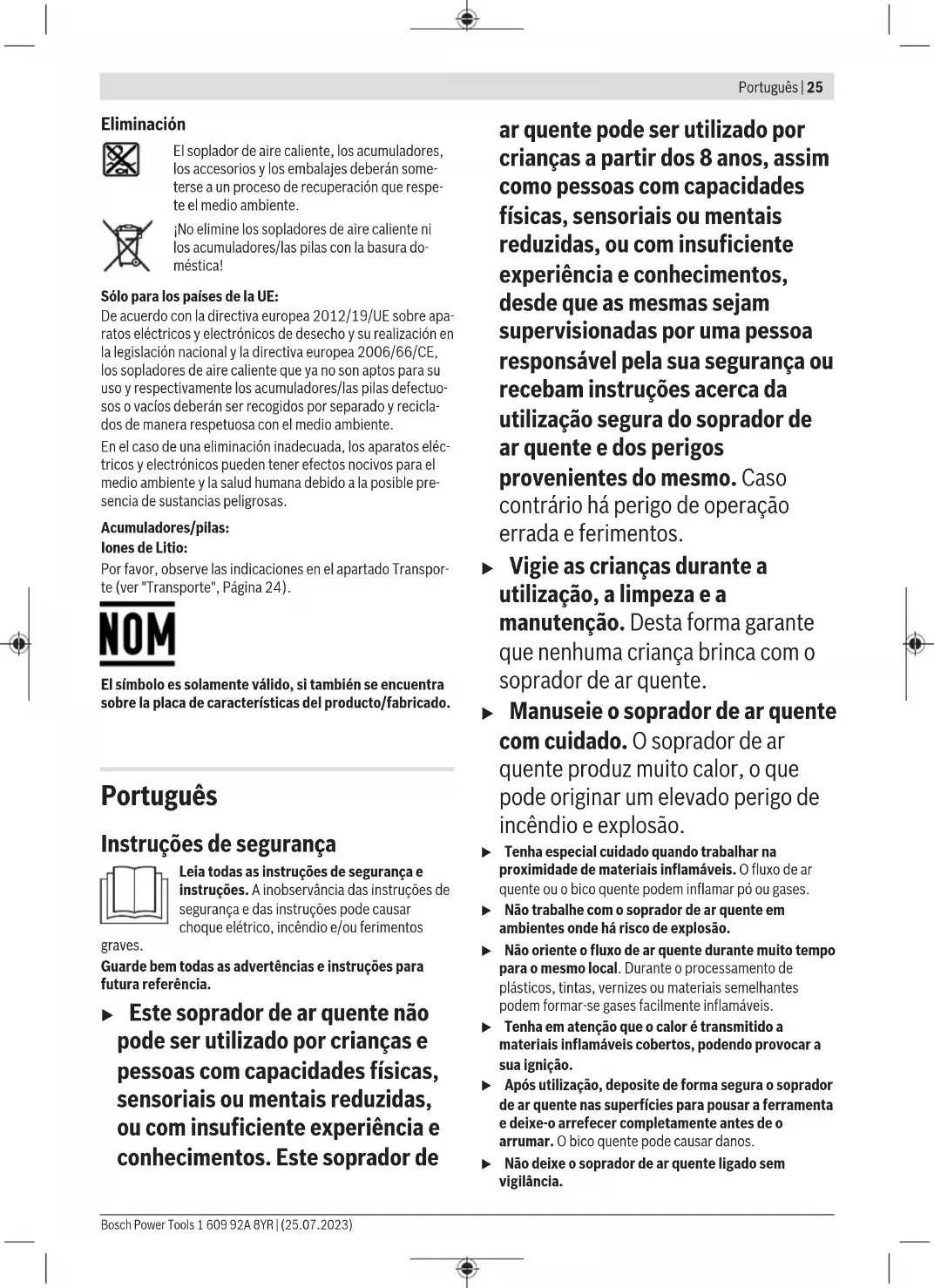 Bateria Bosch vende sopradores de ar quente sem fio também sem bateria. Pode consultar na embalagem se está incluída uma bateria no volume de fornecimento do seu soprador de ar quente. Carregar a bateria u Utilize apenas os carregadores listados nos dados técnicos. Só estes carregadores são apropriados para as baterias de lítio utilizadas no seu soprador de ar quente. Nota: devido a normas de transporte internacionais, as baterias de lítio são fornecidas parcialmente carregadas. Para assegurar a completa potência da bateria, a bateria deverá ser carregada completamente antes da primeira utilização. Colocar a bateria u Não coloque a bateria com violência. A bateria está construída de forma a só poder ser encaixada no soprador de ar quente na posição certa. Insira a bateria carregada no respetivo encaixe, até que esta esteja engatada. A bateria de iões de lítio está protegia contra descarga completa pelo sistema "Electronic Cell Protection (ECP)". Com a bateria descarregada, o soprador de ar quente é desligado através de um circuito de proteção. Retirar a bateria Para retirar a bateria, pressione a respetiva tecla de desbloqueio e puxe a bateria para fora. Não empregue força. Indicador do nível de carga da bateria Nota: Nem todos os tipos de bateria dispõem de um indicador do nível de carga de bateria. Os LEDs verdes do indicador do nível de carga da bateria indicam o nível de carga da bateria. Por motivos de segurança, a consulta do nível de carga só é possível com o soprador de ar quente parado. Prima a tecla para o indicador do nível de carga da bateria ou para visualizar o nível de carga. Isto também é possível com a bateria removida. Se, depois de premir a tecla para o indicador do nível de carga da bateria, não se acender qualquer LED, a bateria tem defeito e tem de ser substituída. Tipo de bateria GBA 18V... LED Capacidade Luz permanente 3× verde 60–100% Luz permanente 2× verde 30–60% Luz permanente 1× verde 5–30% Luz intermitente 1× verde 0–5% Tipo de bateria ProCORE18V... LED Capacidade Luz permanente 5× verde 80–100% Luz permanente 4× verde 60–80% Luz permanente 3× verde 40–60% Luz permanente 2× verde 20–40% Luz permanente 1× verde 5–20% Luz intermitente 1× verde 0–5% Indicações sobre o manuseio ideal da bateria Proteger a bateria contra humidade e água. Bosch Power Tools 1 609 92A 8YR | (25.07.2023)28 | Português Armazene a bateria apenas na faixa de temperatura de −20°C a 50°C. Por exemplo, não deixe a bateria dentro do automóvel no verão. Limpar de vez em quando as aberturas de ventilação da bateria com um pincel macio, limpo e seco. Um tempo de funcionamento reduzido após o carregamento indica que a bateria está gasta e que deve ser substituída. Observe as indicações sobre a eliminação de forma ecológica. Funcionamento Colocação em funcionamento u Remova a bateria antes de substituir acessórios ou de guardar o soprador de ar quente. Esta medida preventiva evita um arranque inadvertido do soprador de ar quente. Formação de fumo na primeira colocação em funcionamento As superfícies de metal vêm protegidas de fábrica com um revestimento contra corrosão. Este revestimento de proteção desaparece na primeira colocação em funcionamento. Devido ao processo de fabrico, o soprador de ar quente pode apresentar descolorações no bico(1). Não se trata de danos, a função do soprador de ar quente não fica limitada. Selecionar o nível de potência Com o ajuste do nível de potência(3) pode selecionar entre 2 diferentes níveis de potência. Ao comutar, a luz de trabalho LED pisca brevemente: – Nível 300°C Com este nível pode, p.ex. descongelar tubos de água ou processar mangas retráteis. Depois de ligar soprador, esta temperatura é alcançada em menos de 6s. Com uma bateria de 8 Ah totalmente carregada o tempo de funcionamento é de até 21min. – Nível 500°C Com este nível pode, p.ex. remover vernizes. Os dados acerca da duração de aquecimento referem-se a medições à temperatura ambiente. Ligar Para ligar prima primeiro o interruptor de desbloqueio(4) e a seguir o Interruptor de ligar/desligar(5). Depois do arranque pode soltar o interruptor de desbloqueio(4), o interruptor de desbloqueio(4) não tem de continuar a ser premido durante o funcionamento. Ao iniciar o soprador de ar quente, a luz de trabalho LED(6) liga-se e ilumina a área de trabalho. Desligar Para desligar solte o interruptor de ligar/desligar(5). Pouse o soprador de ar quente sobre a bateria(8), para que arrefeça. Proteção contra rearranque involuntário Se a bateria(8) for removida com o soprador de ar quente a funcionar e voltar a ser colocada com o Interruptor de ligar/ desligar(5) pressionado, a proteção contra arranque involuntário é ativada. A luz de trabalho LED(6) pisca e o soprador de ar quente não arranca. Liberte o interruptor de ligar/desligar(5) e volte a ligar o soprador de ar quente para continuar a trabalhar. Proteção contra sobrecarga para a bateria Se a bateria(8) ficar muito quente durante o funcionamento, a potência é reduzida. A luz de trabalho LED(6) pisca devagar, enquanto o interruptor de ligar/ desligar(5) é premido. Se o soprador de ar quente continuar a ser usado e a temperatura da bateria continuar a subir, o soprador de ar quente desliga-se automaticamente. Potência reduzida O soprador de ar quente é compatível com todas as baterias de 18V Bosch Professional disponíveis. No funcionamento do soprador de ar quente com baterias inferiores aos 4Ah recomendados, o soprador de ar quente não alcança capacidade total de potência no nível 500°C (a temperatura não é alcançada e o caudal de ar é reduzido). Para mostrar que o soprador de ar quente está a trabalhar com potência reduzida, a luz de trabalho LED(6) pisca várias vezes em ciclo lento quando se liga. Indicadores LED A luz de trabalho LED(6) também é usada como indicador LED de esta