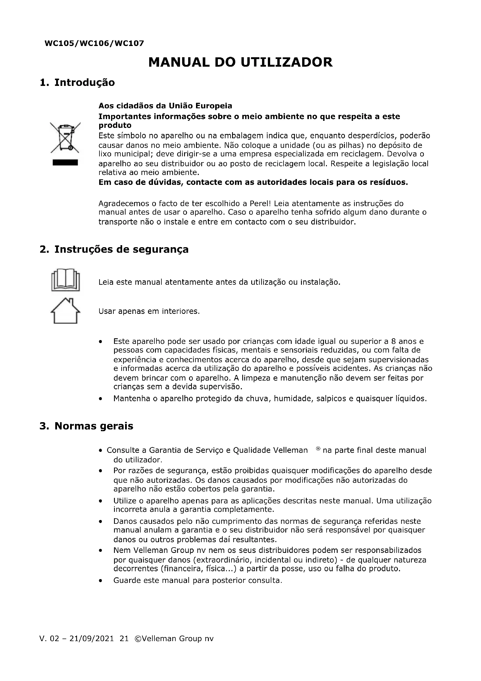 Utilize este aparelho apenas com acessórios originais. A Velleman Group nv não será responsável por quaisquer danos ou lesões causados pelo uso (indevido) do aparelho. Para mais informação sobre este produto e para aceder à versão mais recente deste manual do utilizador, visite a nossa página www.perel.eu. Podem alterar-se as especificações e o conteúdo deste manual sem aviso prévio.