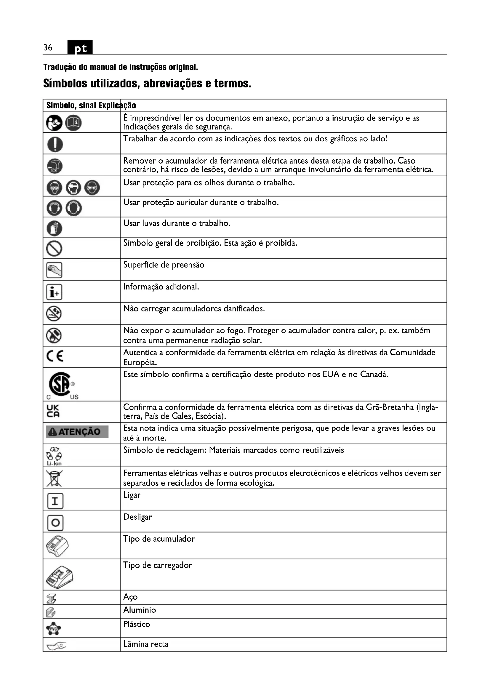 Tradução do manual de instruções original. Símbolos utilizados, abreviações e termos. Símbolo, sinal Explicação É imprescindível ler os documentos em anexo, portanto a instrução de serviço e as indicações gerais de segurança. Trabalhar de acordo com as indicações dos textos ou dos gráficos ao lado! Remover o acumulador da ferramenta elétrica antes desta etapa de trabalho. Caso contrário, há risco de lesões, devido a um arranque involuntário da ferramenta elétrica. Usar proteção para os olhos durante o trabalho. Usar proteção auricular durante o trabalho. Usar luvas durante o trabalho. Símbolo geral de proibição. Esta ação é proibida. Superfície de preensão Informação adicional. Não carregar acumuladores danificados. Não expor o acumulador ao fogo. Proteger o acumulador contra calor, p. ex. também contra uma permanente radiação solar. Autentica a conformidade da ferramenta elétrica em relação às diretivas da Comunidade Européia. Este símbolo confirma a certificação deste produto nos EUA e no Canadá. Confirma a conformidade da ferramenta elétrica com as diretivas da Grã-Bretanha (Ingla- terra, País de Gales, Escócia). Esta nota indica uma situação possivelmente perigosa, que pode levar a graves lesões ou até à morte. Símbolo de reciclagem: Materiais marcados como reutilizáveis Ferramentas elétricas velhas e outros produtos eletrotécnicos e elétricos velhos devem ser separados e reciclados de forma ecológica. Ligar Desligar Tipo de acumulador Tipo de carregador Aço Alumínio Plástico Lâmina recta37