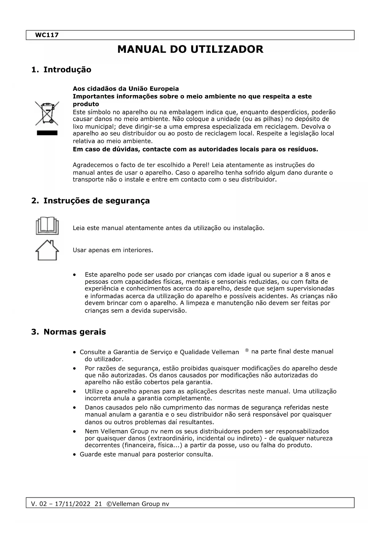 A Velleman Group nv vem por este meio declarar que o equipamento de rádio tipo [WC117] está em conformidade com a Diretiva 2014/53/EU.
